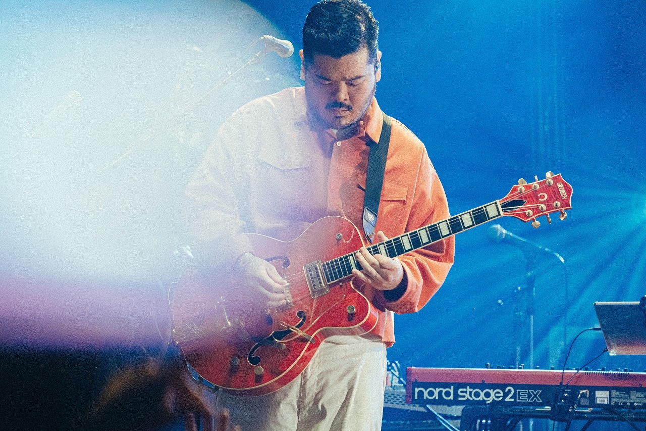 エレクトリックギターを爪弾きながら、即興で歌詞を紡ぎ出すHIROSHIが楽しい。序盤3曲「Perfect Vacation」「Sunshine」「Don’t Be Someone Else」がリズム主体のダンスセクションなら、ここからはメロディックなロック/ポップセクション。アップビートなアップテンポがはじける「Happy Sad」から「Summertime」へ、ほぼ全曲にクラップとコーラスパートがあるから、いやがうえにも盛り上がる。シティポップ風味の爽やかな「Dance with Misery」から、メロウなWATARUのギターと山本健太のピアノが美しい風景画を描き、HIROSHIが熱いボーカルをぶつける「Liberty」へ。リズムの強さとメロディの優しさ、歌のしなやかさが絡み合って作り出すオリジナルカクテル、これがFINOのクルージング。