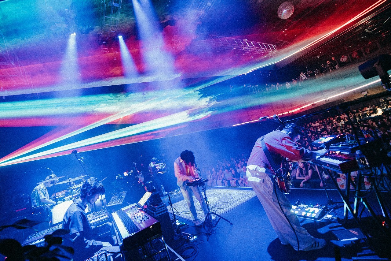 先週リリースされたばかりの新曲「Touhikou」は、FINOらしい爽快なリズムとスムースなメロディ、めまぐるしく変わるコード展開、精密な音の重なりが癖になるポップチューン。“たーりないな”と聴こえるサビがめちゃくちゃキャッチー、ライブ初披露のはずだがサビの大合唱もパーフェクトだ。レーザービームが太陽や車やヤシの木を描き出す、ファニーな演出も楽しい。そのままの勢いで突入した「Trickster」は、HIROSHIの「跳べる?」という煽りに応えてフロアは大張り切り、今日イチのジャンプ大会で大盛り上がり。HAYATOが一人でスポットを浴びる見せ場もある。言うまでもなく、FINOのライブは全員が主役だ。