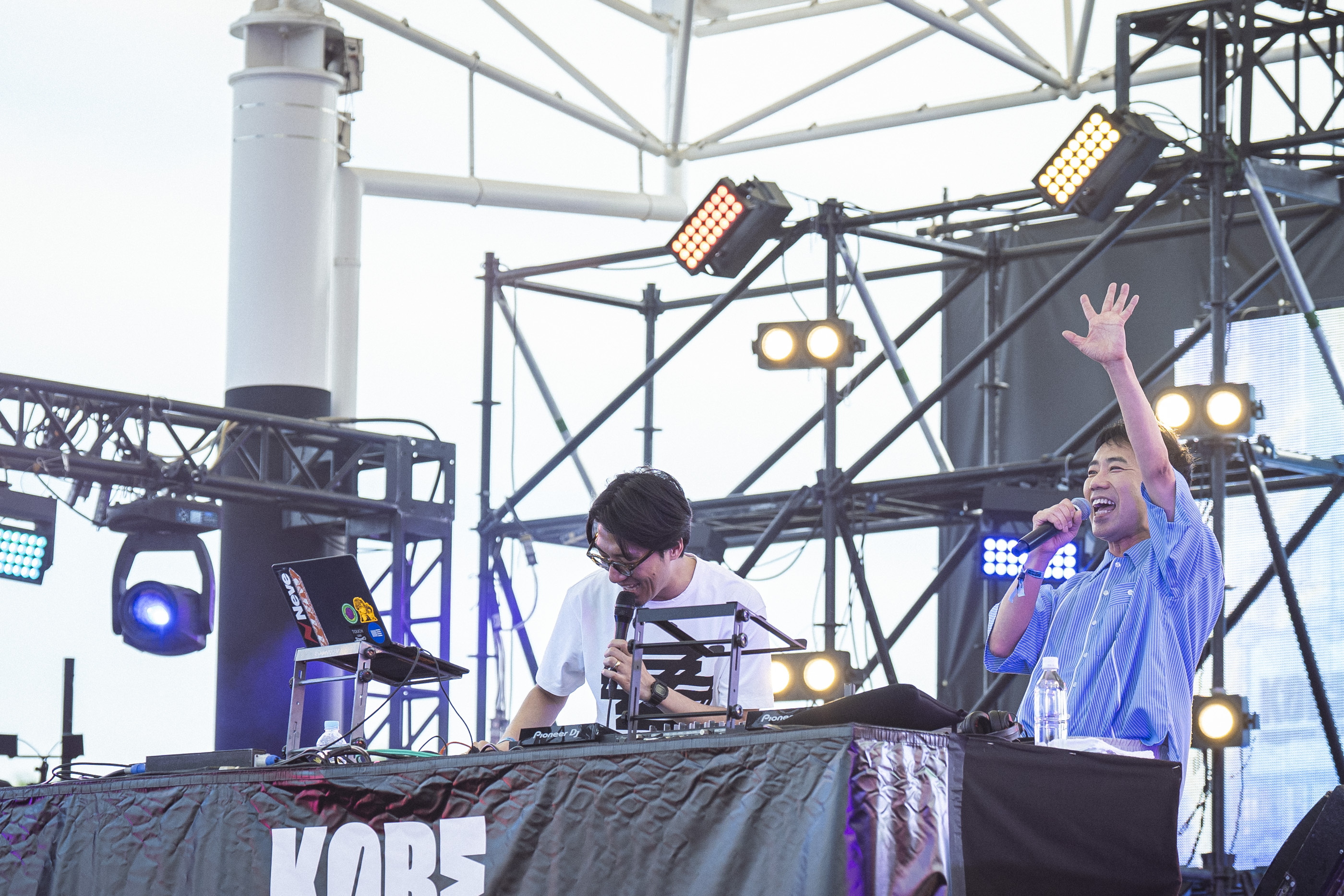 雲一つない晴天……とはいえ、容赦なく照りつける太陽の熱で項垂れそうなところへ、tofubeatsが「I CAN FEEL IT」「RUN」とご機嫌なトラックをぶつけていく。さすが『メロクル』常連&神戸出身、地元のオーディエンスを盛り上げる術は熟知していて、あっという間にフロアのテンションも上昇。「don’t like u」ではNeibissと、「LOVE」ではAile The Shotaとコラボ。さらに、「ライブっぽいことも!」と、藤井隆とともに「ディスコの神様」をプレイ。爽やかにステージインした藤井隆は「みんな最高~♪」と、オシャレなサウンドに合わせ、抜群のリズム感で歌い踊る。ハッピーオーラいっぱい、胸キュンしまくりのステージで観客を虜にしていった。