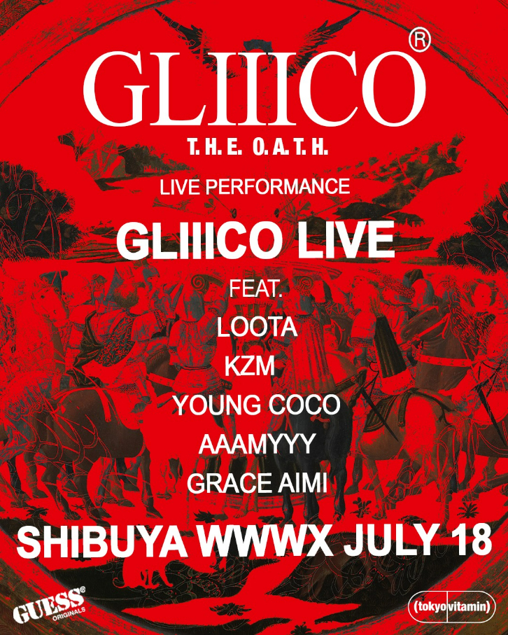 Gliiicoは、Nico(G)、Kai(Vo)、Kio(B)の3兄弟からなるカナダ・バンクーバー出身のバンド。『Gliiico The Oath』は、2024年に予定されているGliiicoのデビューEP『The Oath』のリリースにさきがけ、tokyovitaminとGUESS Originalsが主催する。当日は、GliiicoのほかAAAMYYY、Grace Aimi、kZm、Loota、Young Cocoをゲストで出演。同EPの全収録曲のほか、ライブ未演奏曲もふくむスペシャルセットでのパフォーマンスを予定しているとのこと。