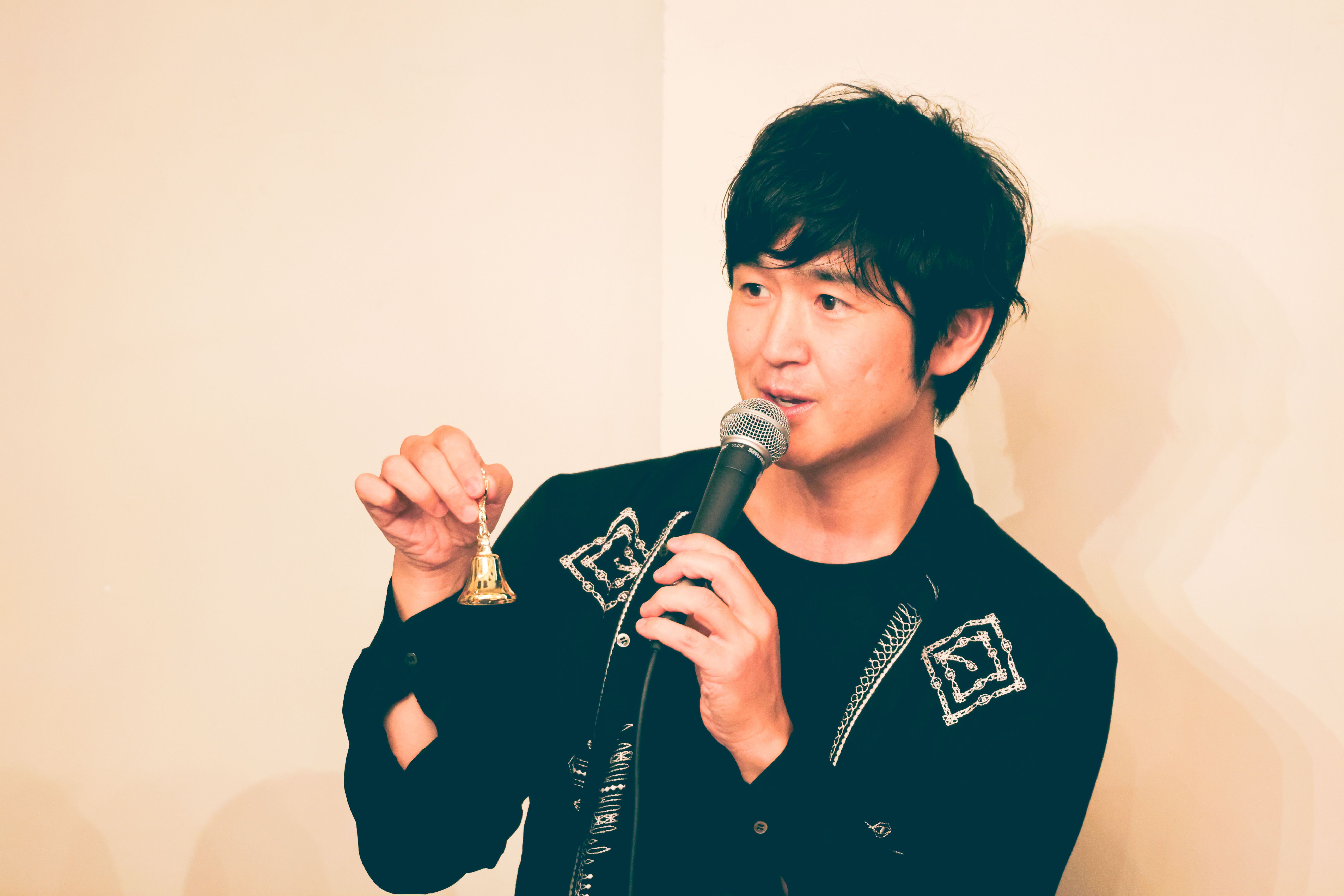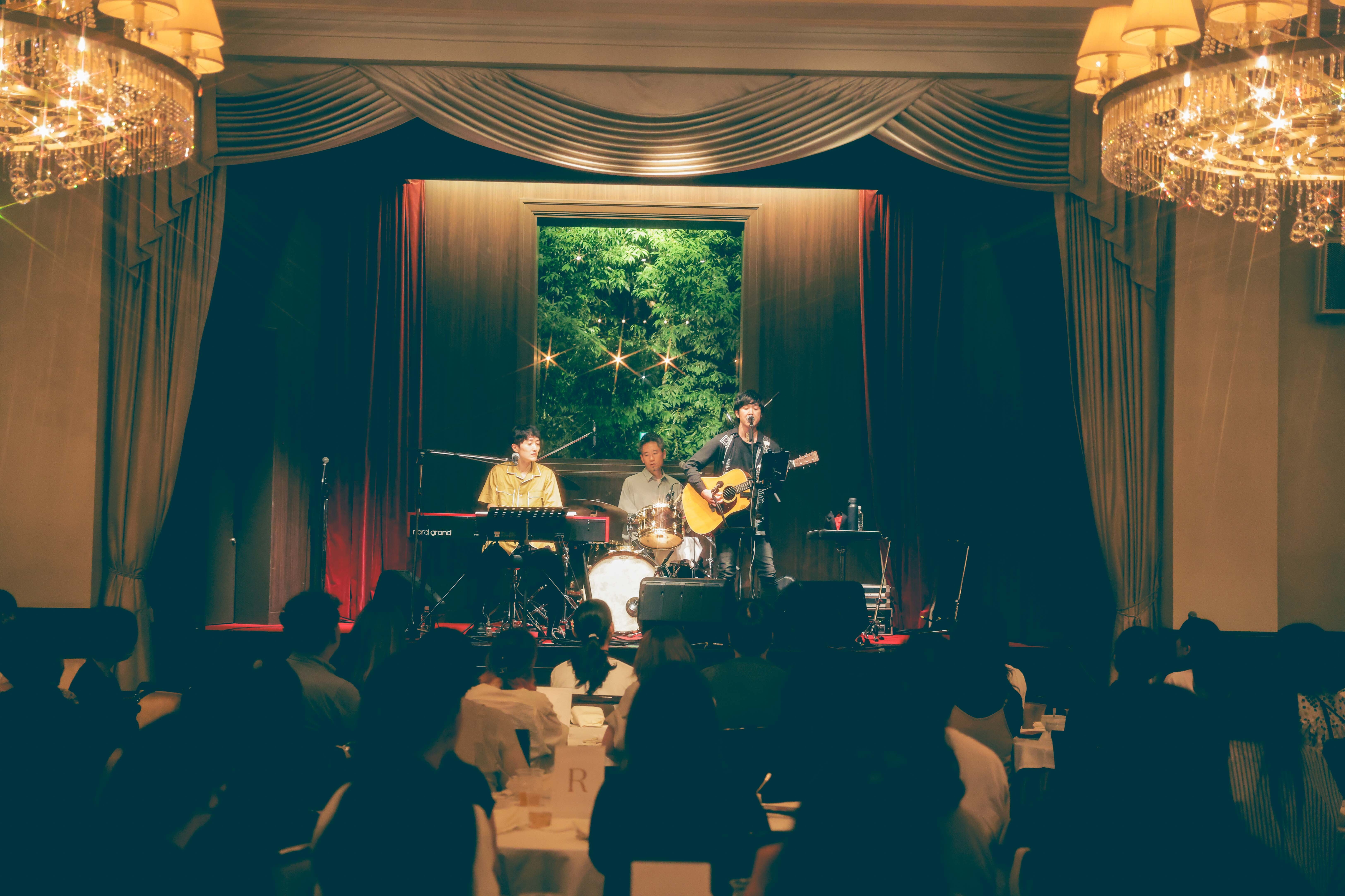 4回目となったこの日は、前回のビルボードライブ大阪から旧桜宮公会堂に場所を移し開催された。昭和10年に明治天皇記念館として建設された旧桜宮公会堂は、国の重要文化財にも指定されている歴史ある建物で、普段は結婚式などが行われている場所。会場となった大広間はシャンデリアが輝くクラシカルな雰囲気が素敵!来場者は、カトラリーがセッティングされた円卓に座って開演を待つ。