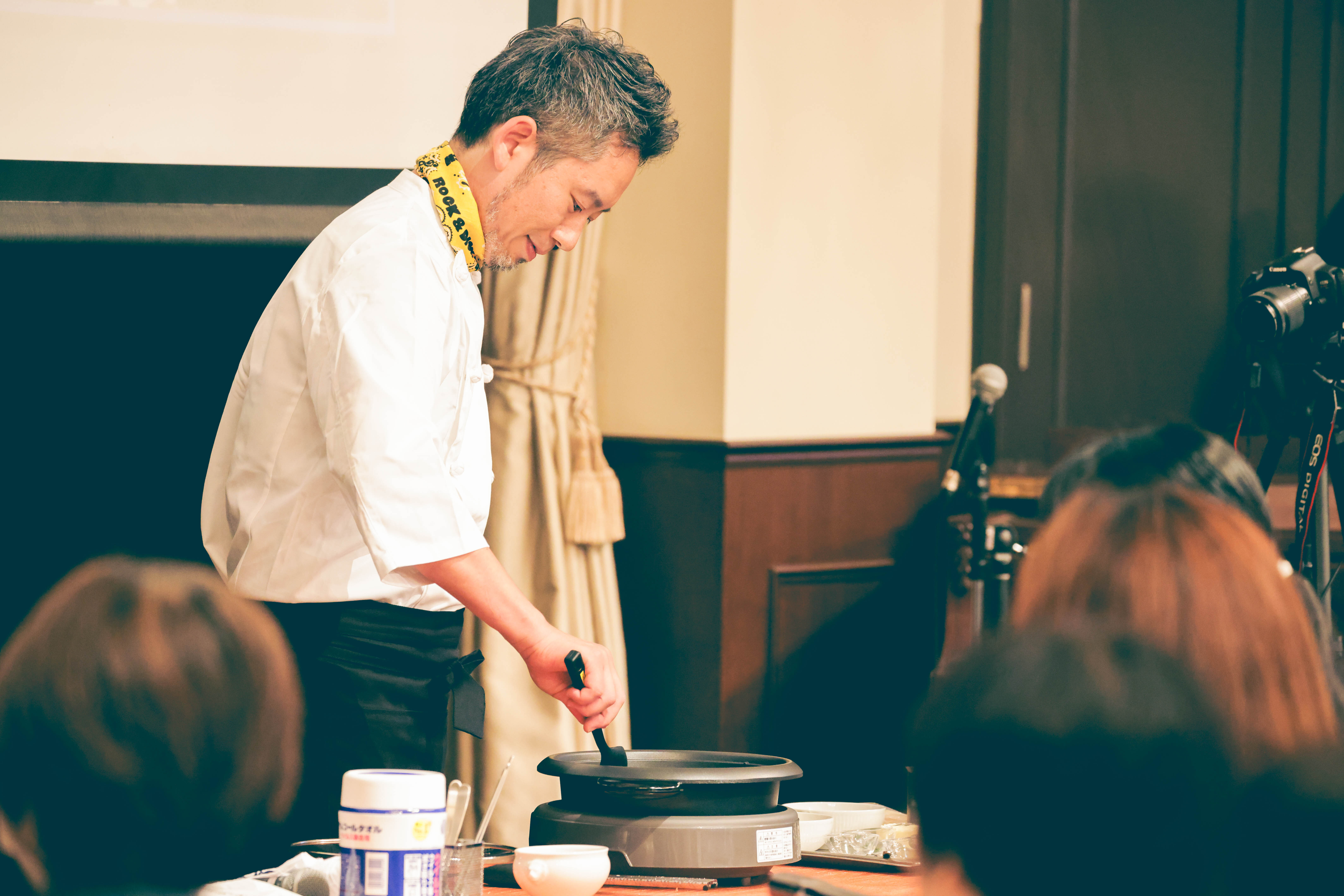 伊地知が「ワイン大好きなんで、大得意です!」と自信たっぷりにはじめた料理は、テスコムの「グリルなべ」を使った「きのこチーズリゾット」。グリルなべは、3.4Lの深鍋で、煮る・焼く・蒸すの3役を1台でできるすぐれものだ。本体から上の部分を取り外して、丸洗いできるのも便利。