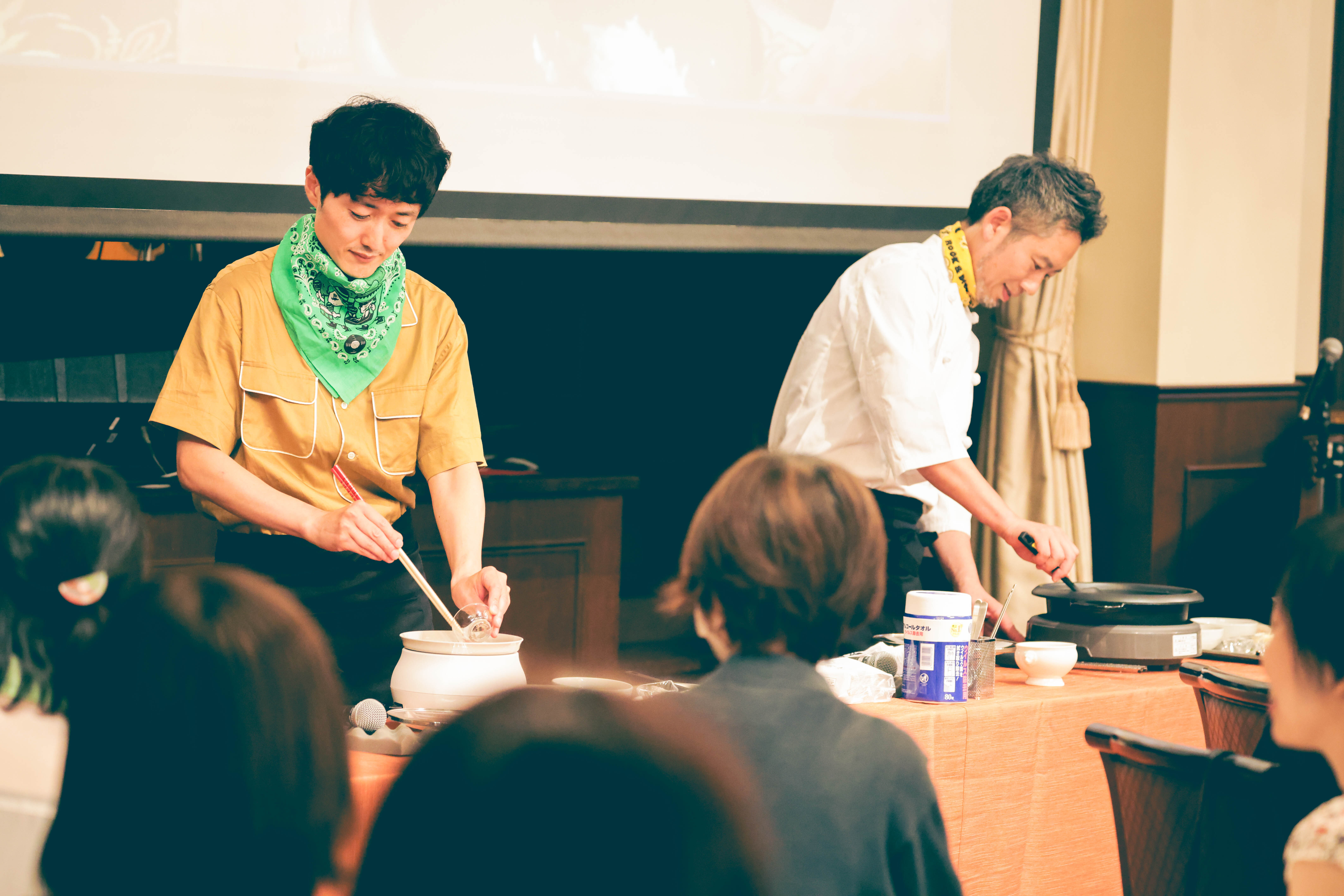 進行兼実況役のFM802 DJ・加藤真樹子は、伊地知と金澤を呼び込むと、「めっちゃシェフじゃないですか!」といつもと違う伊地知の衣装に注目。伊地知は、「通販で(衣装を)買って、すぐダイちゃんにラインしたよね」と、この日のために用意したという白のコックコートをビシっと身にまとい、気合い十分だ。あまりの似合いように、「厨房から出てきた人みたい(笑)」と金澤も絶賛。お揃いのエプロンとバンダナをつけると、料理コーナーからイベントがスタートした。