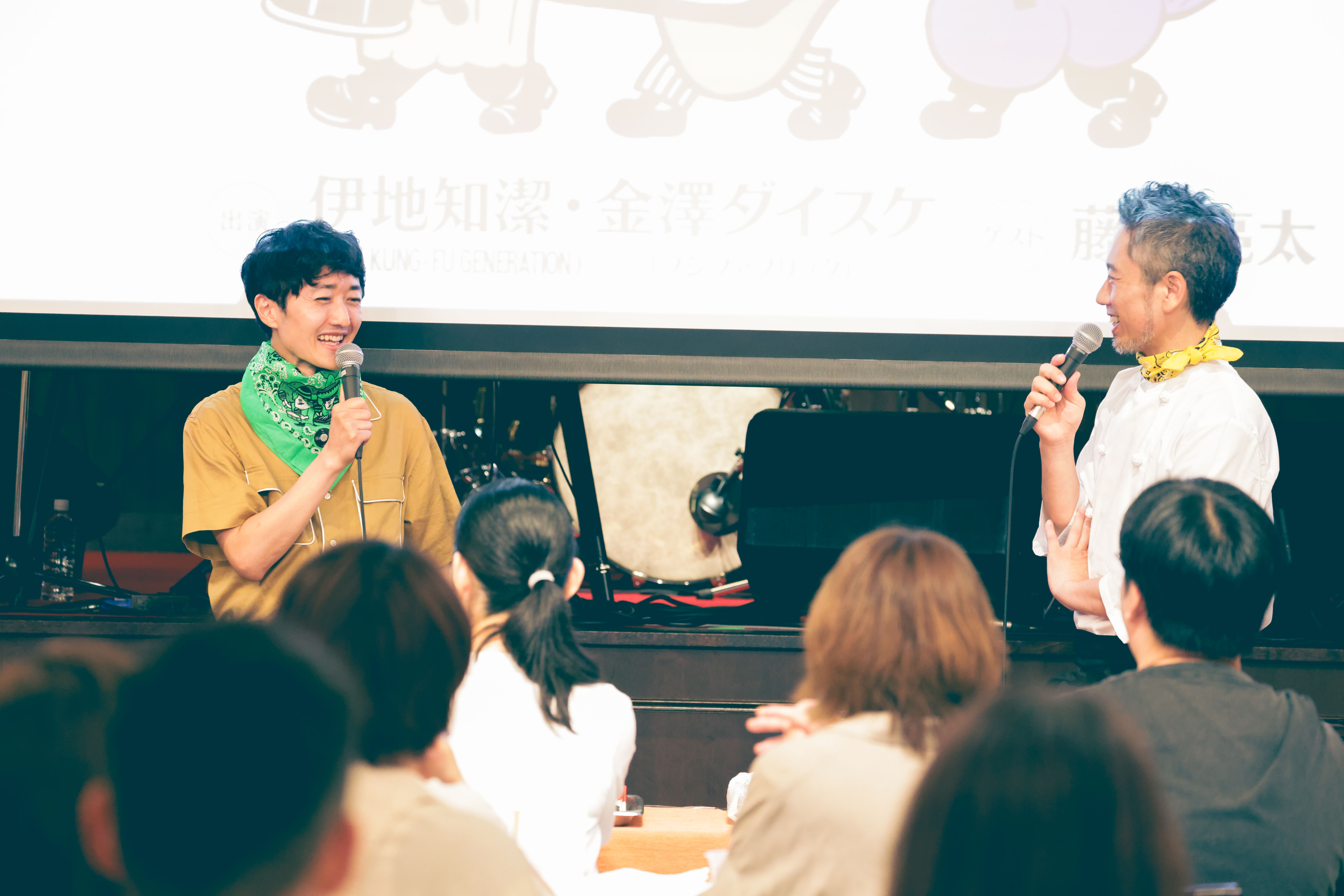 後半は待ちに待ったスペシャルセッション。照明が落とされ、ライブ仕様となった会場に、3人がスタンバイすると大きな拍手が。「このメンバーでセッションするのははじめて。すごくリハが楽しくて。ふたりをリスペクトしているので、3人それぞれの曲をやります!」と、アコギをかかえた藤巻が1曲目に選んだのは、「ポップでロックでカッコよくて大好きな曲」と紹介したASIAN KUNG-FU GENERATION「ループ&ループ」。柔らかく包容力のある藤巻のヴォーカルがこの曲の持つ独特のグルーヴにハマりすぎている。演奏後の大きな歓声に「うれしいなあ」と笑顔を見せる3人だった。