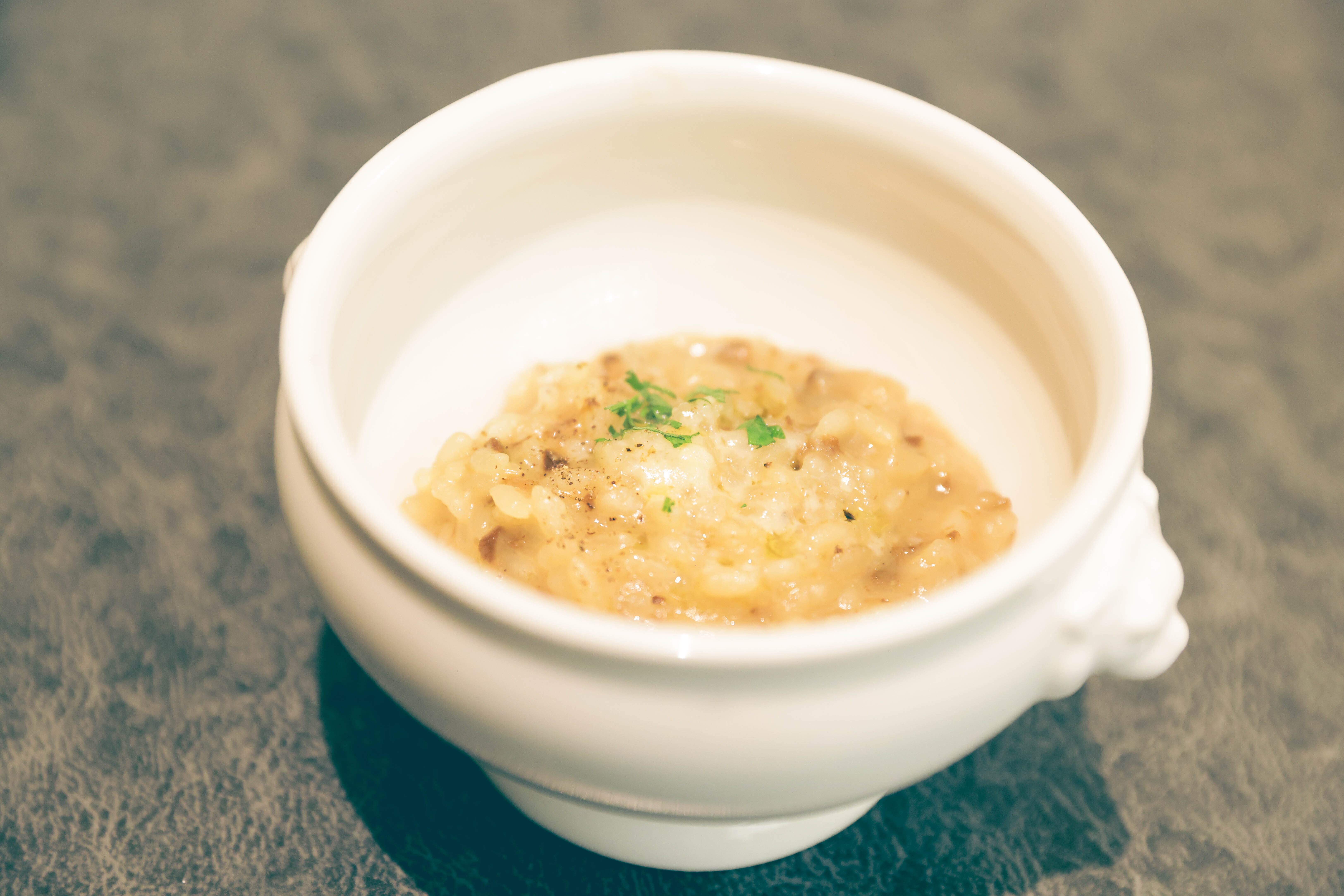 玉ねぎとニンニクのみじん切りをオリーブオイルで炒めて、玉ねぎが透明になったら、生米と乾燥ポルチーニ茸、白ワインをグルルなべへ。きのこの戻し汁にブイヨンを溶かしたスープを入れて、蓋をすればあとは待つだけ。「リゾットはアルデンテにしたいので、ポイントはあまりさわらない事。さわりすぎると米の粘りが出て、おじやみたいになってしまうんです」と伊地知が解説すると、お客さんは真剣に聞き入っていた。