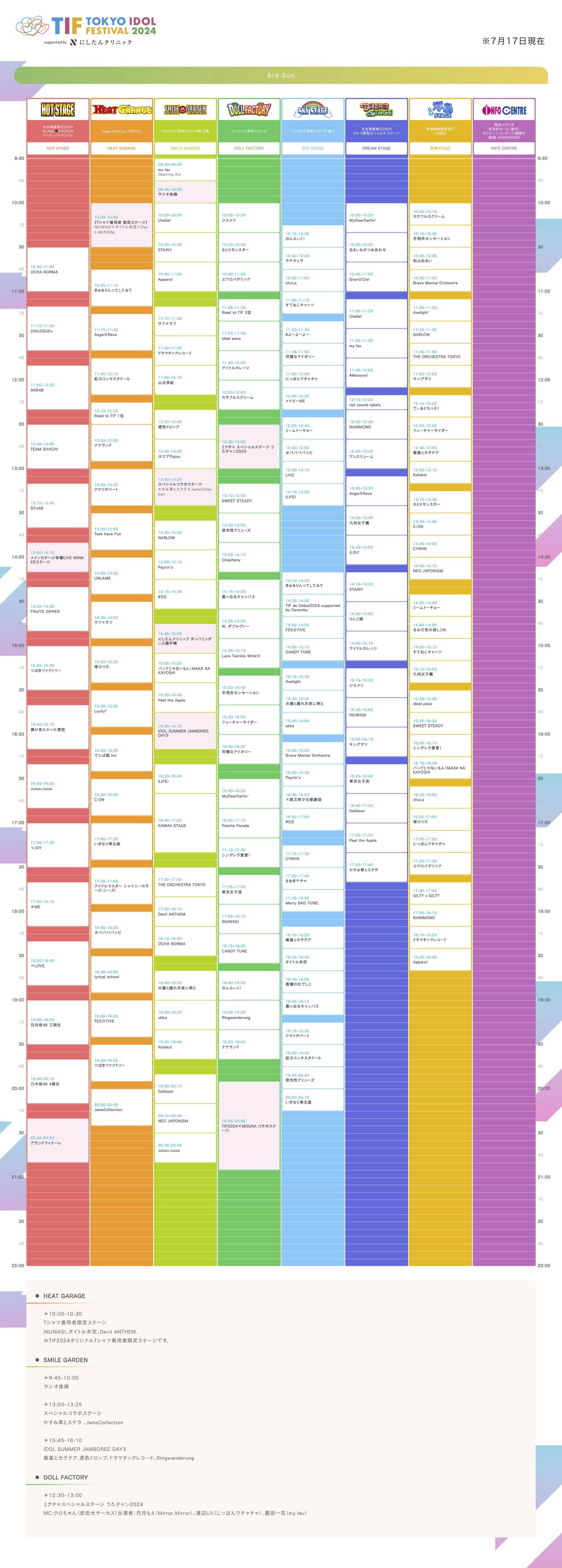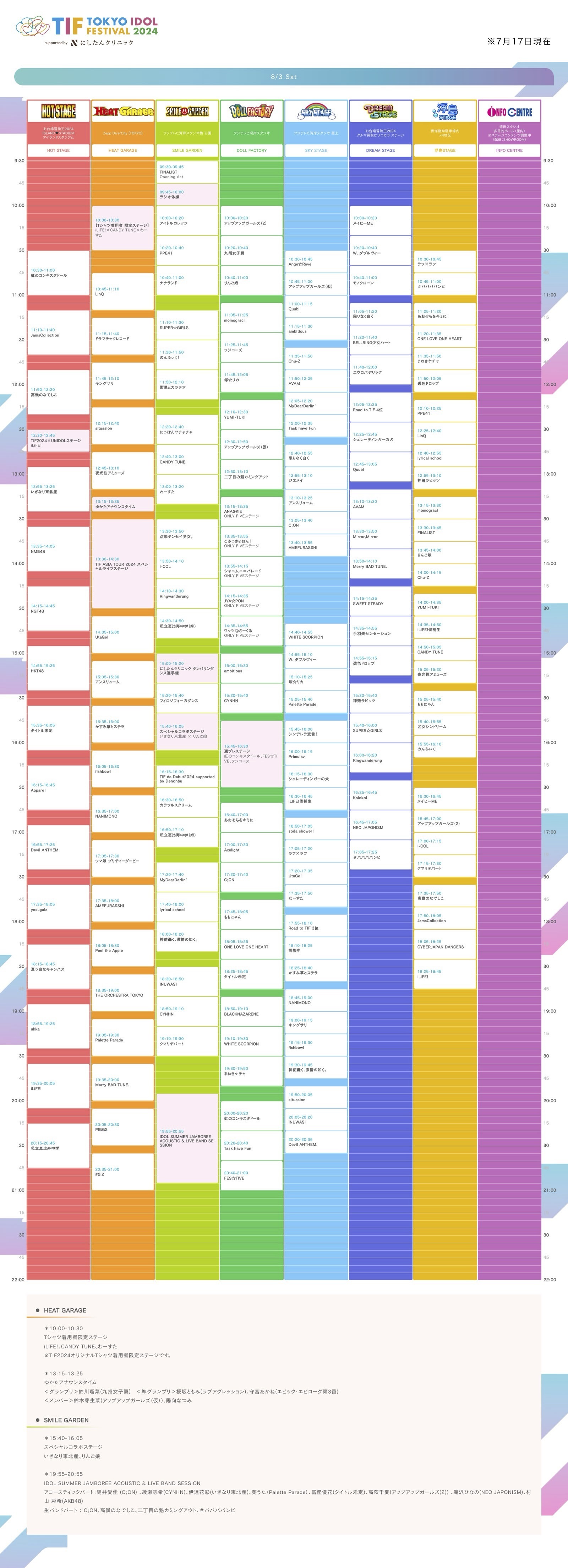 2024年8月2日(金)、3日(土)、4日(日)の3日間、お台場・青海周辺エリアにて開催される『TOKYO IDOL FESTIVAL 2024』(以下、TIF2024)のタイムテーブルが公開された。