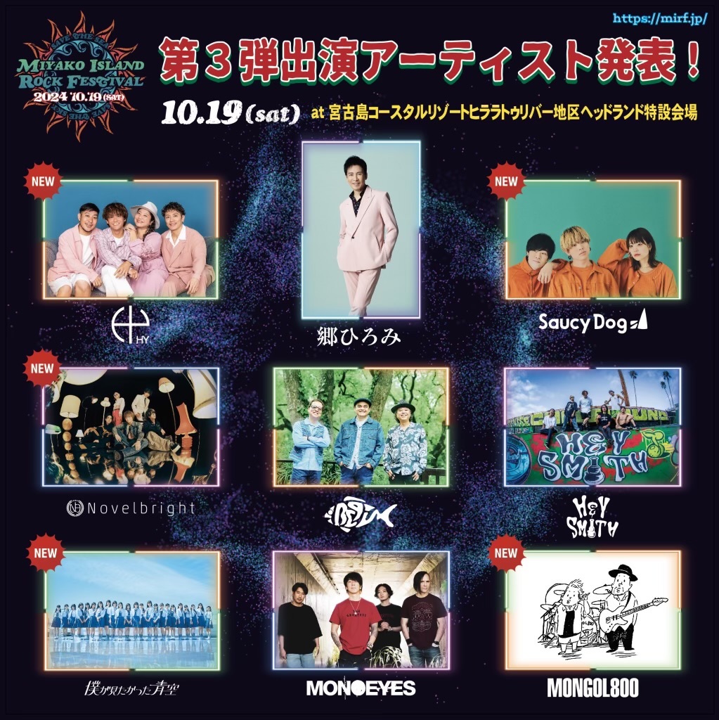 2024年10月19日(土)、沖縄県・宮古島コースタルリゾートヒララ トゥリバー地区 ヘッドランド特設会場にて開催される、日本最南端のロックフェス『MIYAKO ISLAND ROCK FESTIVAL 2024』の第3弾アーティストで、HY、Saucy Dog、Novelbright、僕が見たかった青空、MONGOL800の出演が発表された。