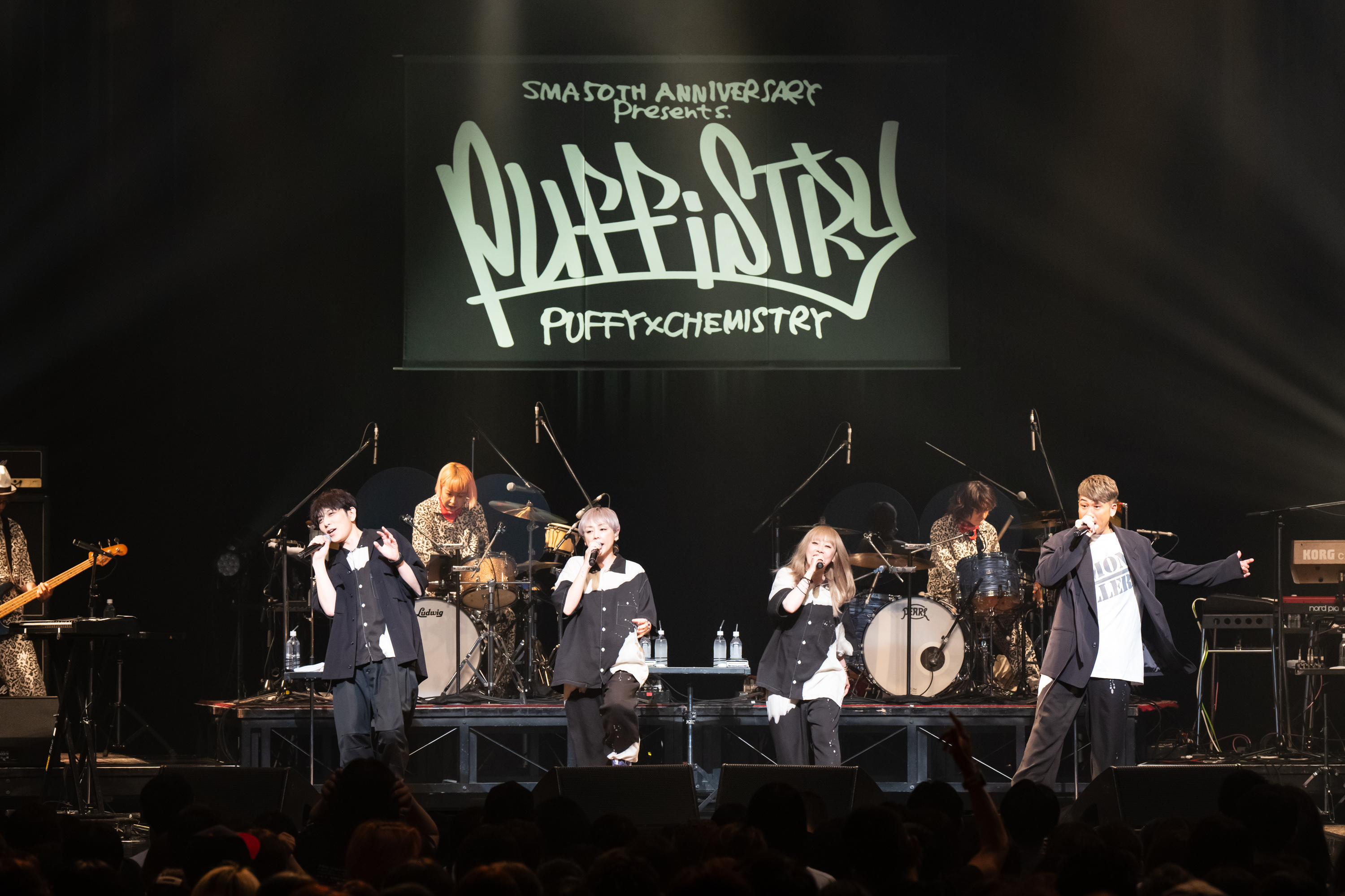7月6日(土)、大阪・なんばHatchにて、PUFFYとCHEMISTRYによるライブ『SMA 50th Anniversary presents パフィストリー』が行われた。本イベントは、PUFFYとCHEMISTRYが所属する総合芸能プロダクション「ソニー・ミュージックアーティスツ(通称SMA)」の創立50周年を記念して行われたもので、SMAでは2024年4月から2025年3月までを「ソニー・ミュージックアーティスツ50周年イヤー」として、所属アーティストらによる50本のライブやイベントの開催を宣言しており、本イベントもその一貫ではある。しかしながら、今回のためにアーティスト写真まで撮るほどの気合いの入れようということで、非常に注目度が高かった。PUFFYとCHEMISTRYは、20年以上同じ事務所の先輩後輩で、同じボーカル・デュオながら、意外にもコラボするのは今回が初めて。「SMAが50周年を迎えるまでのなかで、実はありそうでなかった。やってみよう!」という想いから実現した。6月22日のTOKYO DOME CITY HALLでのデビューライブを経て、なんばHatchでのライブが2度目、そして千秋楽にして解散ライブとなったパフィストリー。見る者全てを笑顔にした素晴らしき奇跡の化学反応の模様をレポートしよう。