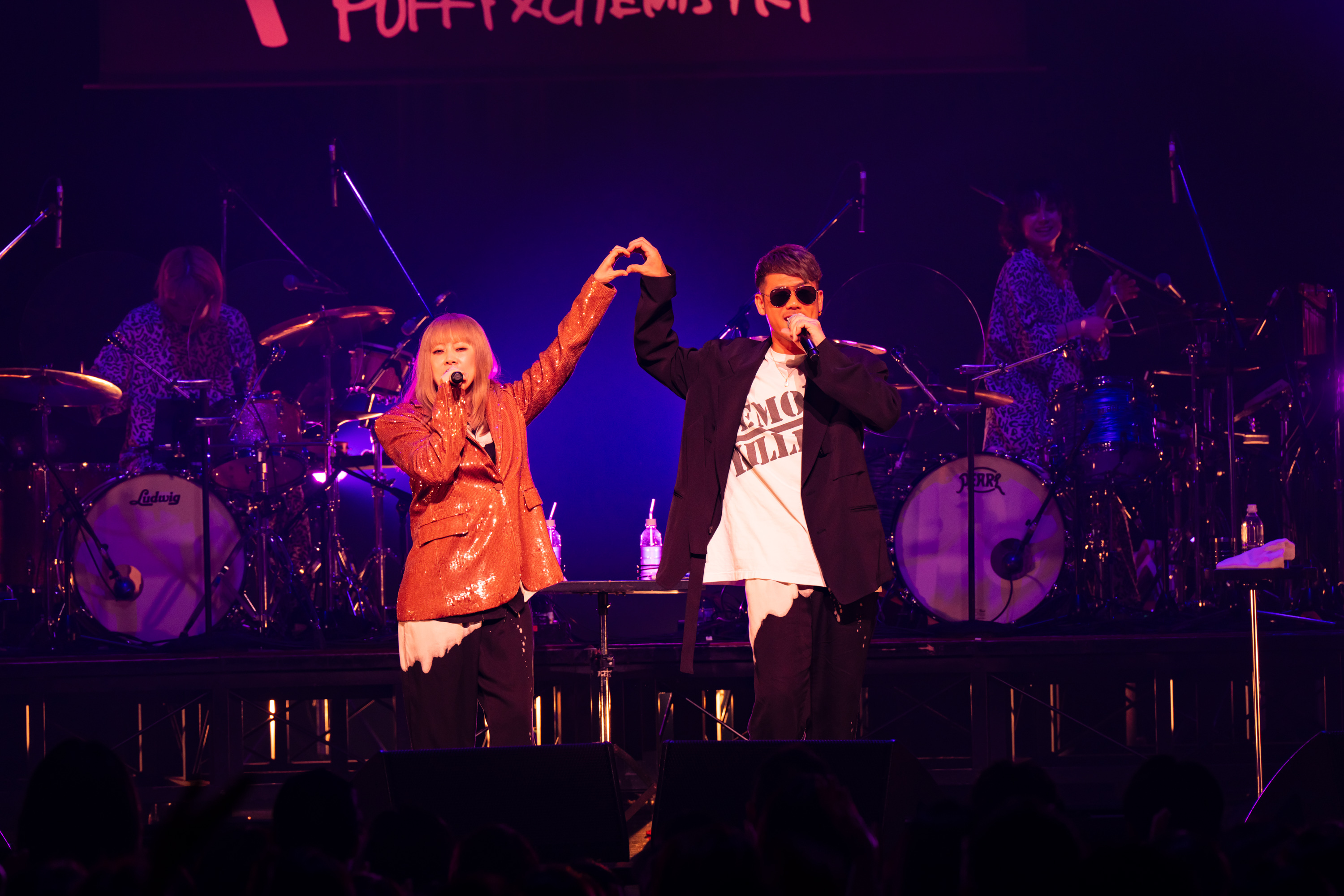 PUFFYは今年デビュー28年、CHEMISTRYは今年デビュー23年。ともにSMAの歴史の中にあり、デビュー以来、日本の音楽シーンはもちろん、海外でも精力的に活動を続けてきた両者。特に平成初期をリアルタイムで過ごした世代にとって、彼らの活躍は今も記憶の片隅で輝き続けているのではないだろうか。1996年にユーロビートやコギャルブームの中、Tシャツ&ジーパン姿で、SMAの重鎮・奥田民生のプロデュースで鮮烈なデビューを飾ったPUFFY、テレビ東京のオーディション番組『ASAYAN』で最終選考に選ばれユニットを結成、2001年にデビューして瞬く間にミリオンセラーを達成し、同年の紅白歌合戦にも出演したCHEMISTRY。当時メディアで彼らの姿を見ない日はなかったと思う。つまりこの2組の組み合わせは、パフィストリーと同年代の人にとってはまさに「ど真ん中」。当時を懐かしく思うと同時に、今も第一線で活躍していることが勇気になっているだろうし、パフィストリーよりも下の世代の人にとっては、TikTokでのリバイバルヒットなどを通して、ポップアイコンとして、実力派ボーカル・デュオとして、新鮮に映っているだろう。この日会場に訪れていたオーディエンスには親子の姿もあり、2組が世代を超えて愛されていることが伝わってきた。