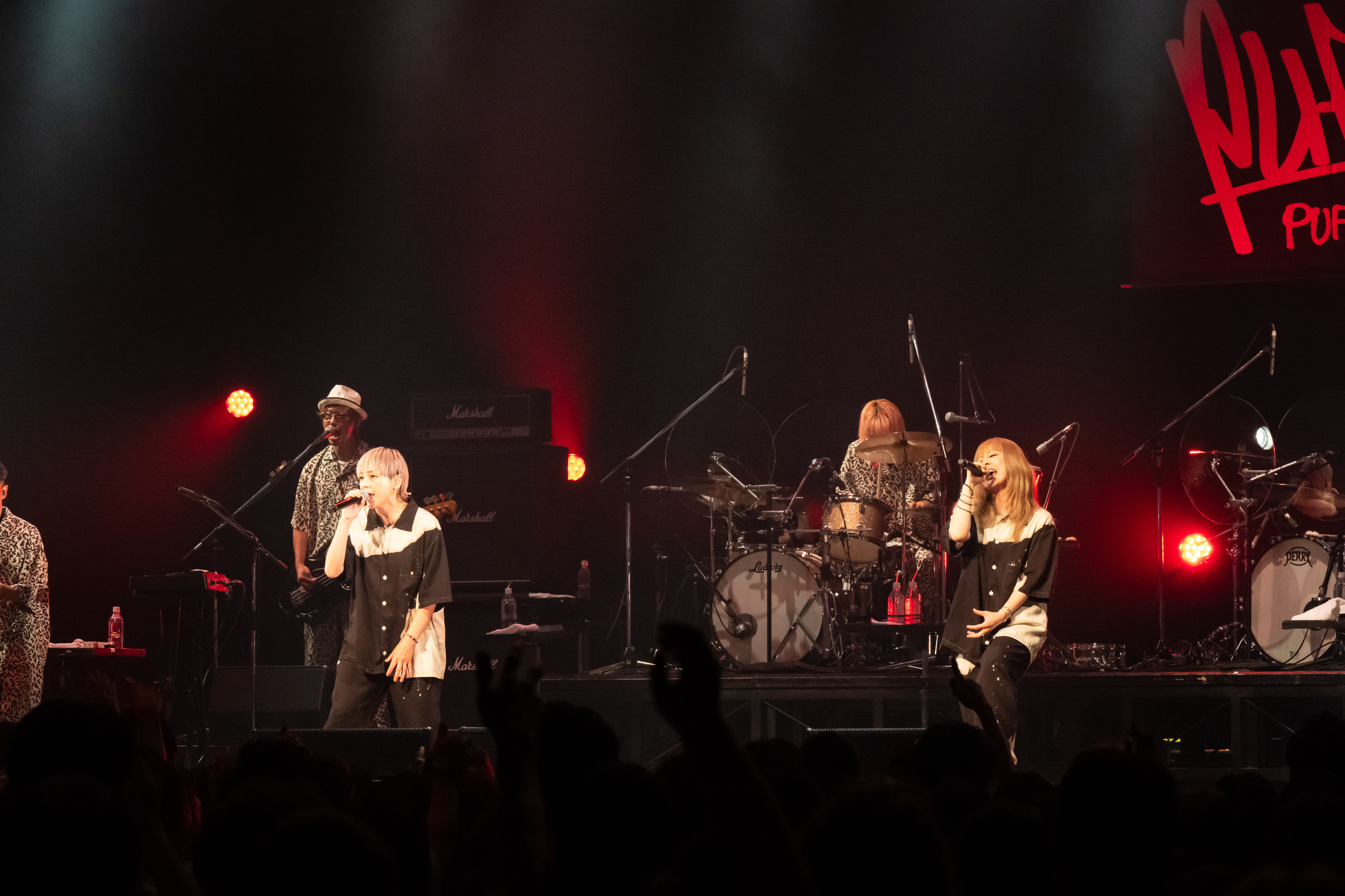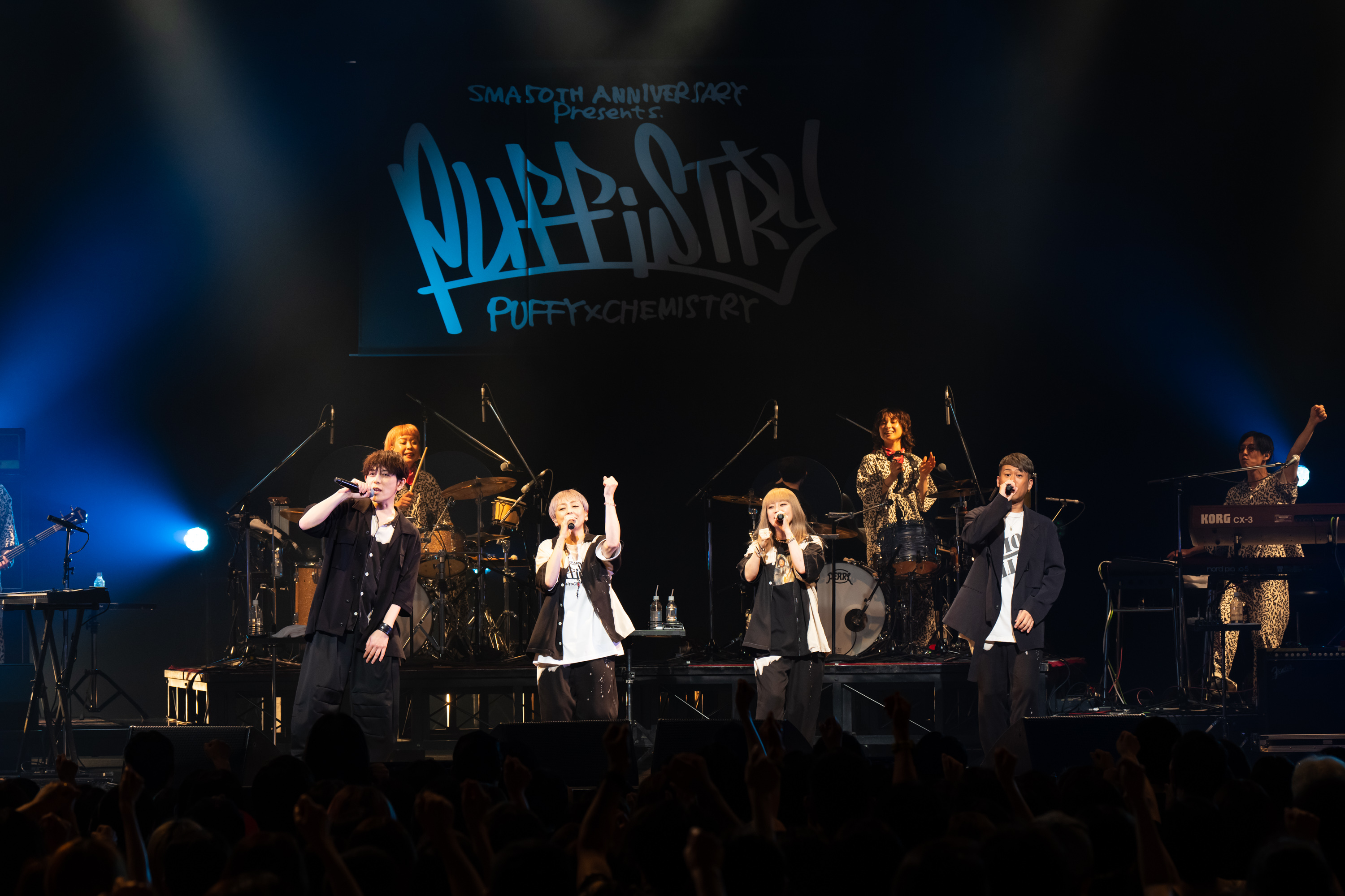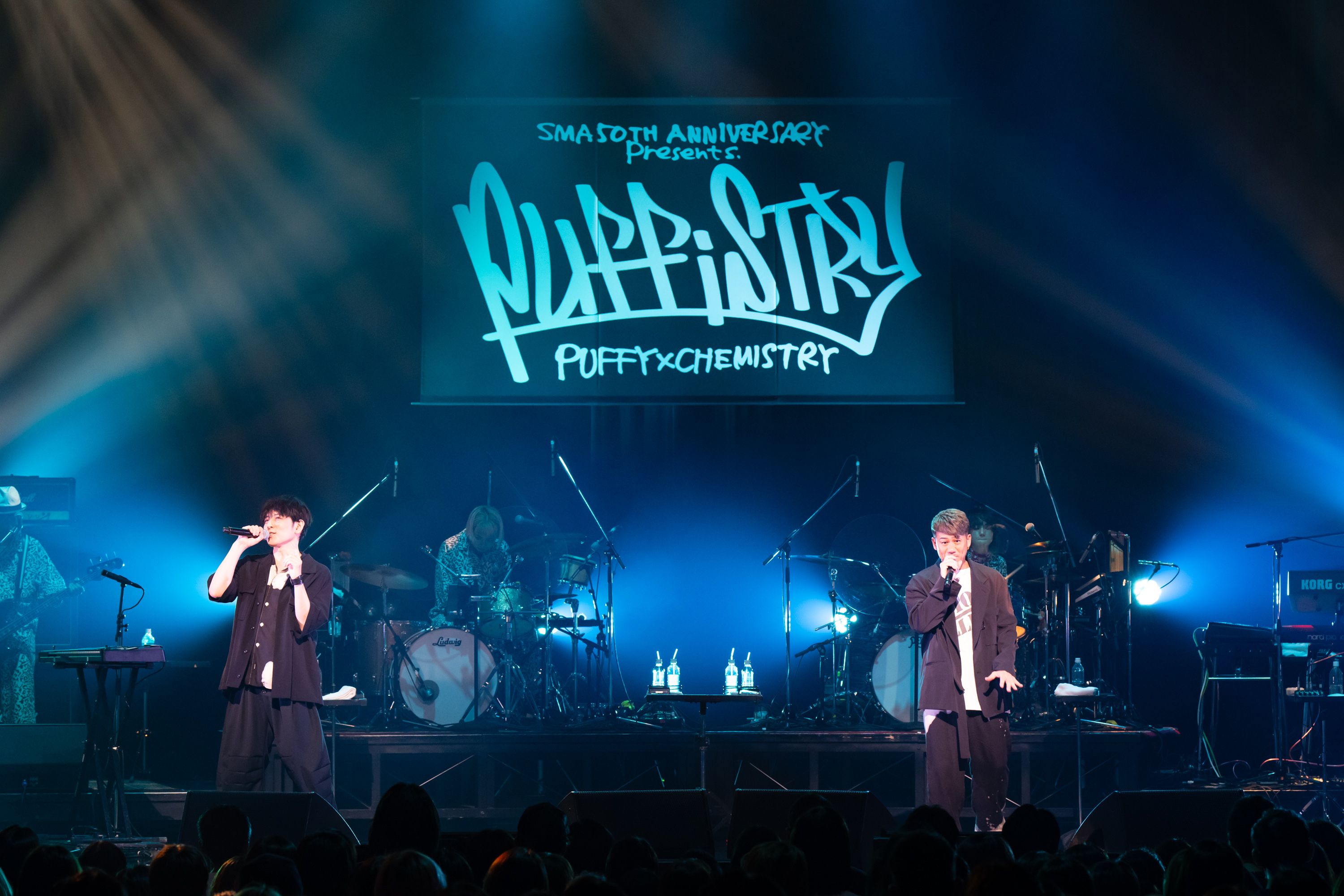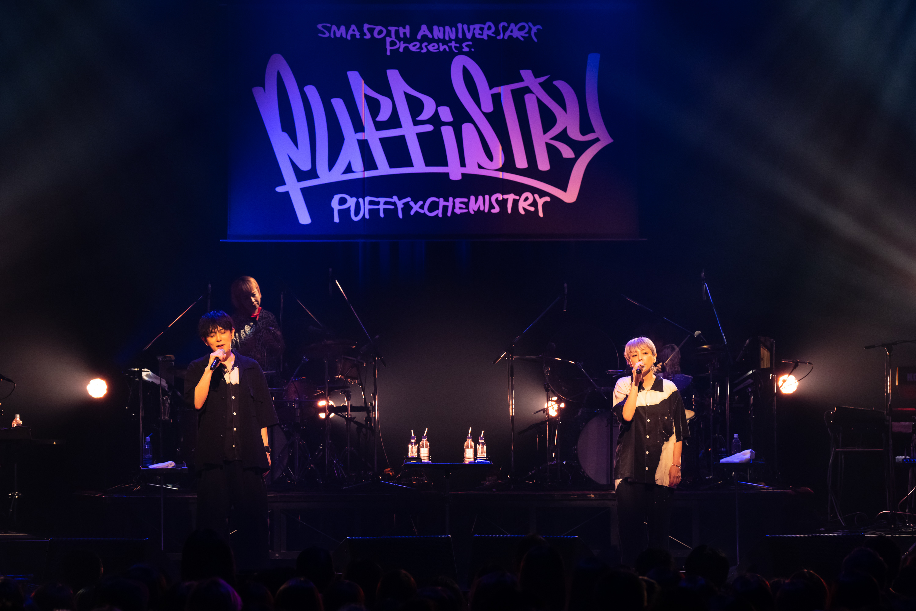 50周年記念とあって、ライブはのっけからスペシャルな展開。「SMA 50thパフィストリーメドレー」として、SMAに所属するアーティストの歴代ヒットナンバーを連続で披露した。重永の鍵盤が優しく鳴り響き、西野カナの「会いたくて会いたくて(2010年)」を川畑が美しく切ない声で歌い始めると、目の前のレアな光景にざわつく客席。やがてそこに重なる堂珍のハモりに大歓声と拍手が贈られた。続く真心ブラザーズの「ENDLESS SUMMER NUDE(1997年)」は大貫と吉村も入り、4人で歌唱。PUFFYによる木村カエラの「リルラ リルハ(2005年)」、CHEMISTRYによるLiSAの「紅蓮華(2019年)」を経て、パフィストリーによるユニコーンの「スターな男(1991年)」では、最高のロックン・ロールに会場全体が大盛り上がり。楽曲後半ではバンドメンバーのそれぞれのソロの見せ場もバッチリキマる。