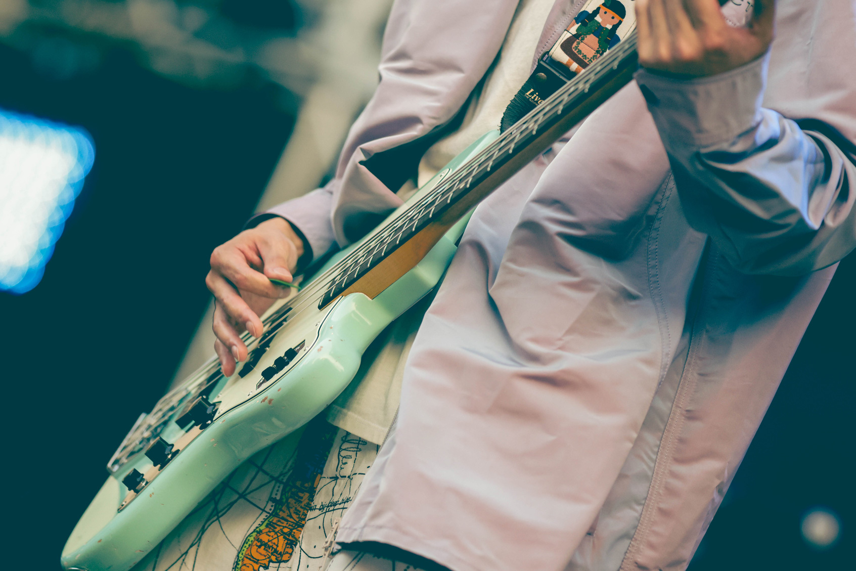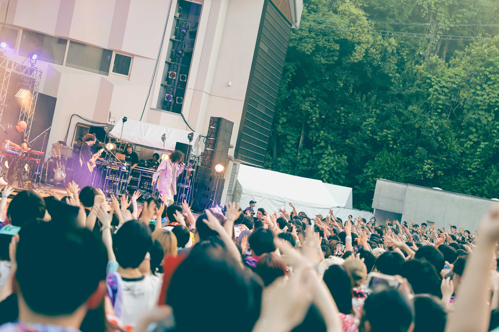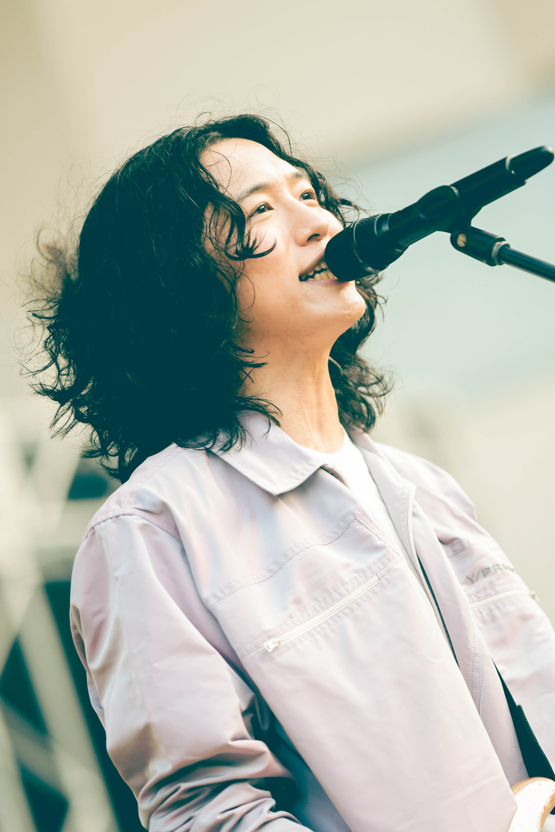 「暑いから倒れないようにしてくださいマジで! 本当は今頃もうちょい暗くなっているつもりでセトリを組んでいたんですが、まだまだ昼ですね(笑)」と、19時前でも明るい真夏の野外ライブ日和に歌い上げた「白無垢」は、大人の色香漂う絶妙なスパイスに。「波に名前をつけること、僕らの呼吸に終わりがあること。」ではベースを弾きながら歌うなど、ボーカルとソングライティングに留まらないマルチな才能でも見る者を魅了。その後も、エレクトロなビートで身も心も踊らせる「Moonthief」、エッジィなギターリフともどもブチ上げる「聖者の行進」と、無双状態で突き進む!