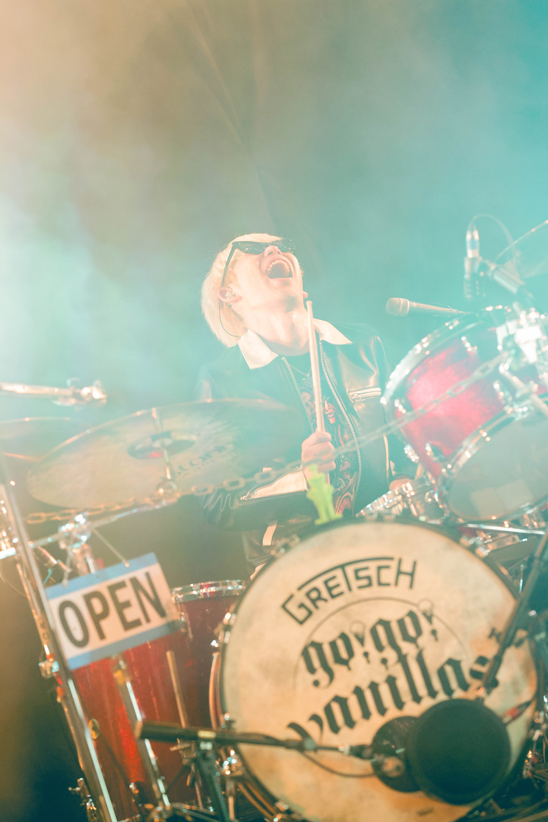 「会いたかったぜ大阪~! 超遊ぼう!!」と牧が天高く手を伸ばし告げた途端に、会場を包み込む何ともハッピーなムード。1曲目の「お子さまプレート」からロックンロールの魔法を目の前で軽々と体現していくgo!go!vanillasが、すっかり日が沈んだ大阪城野音に「クライベイビー」をかき鳴らす!