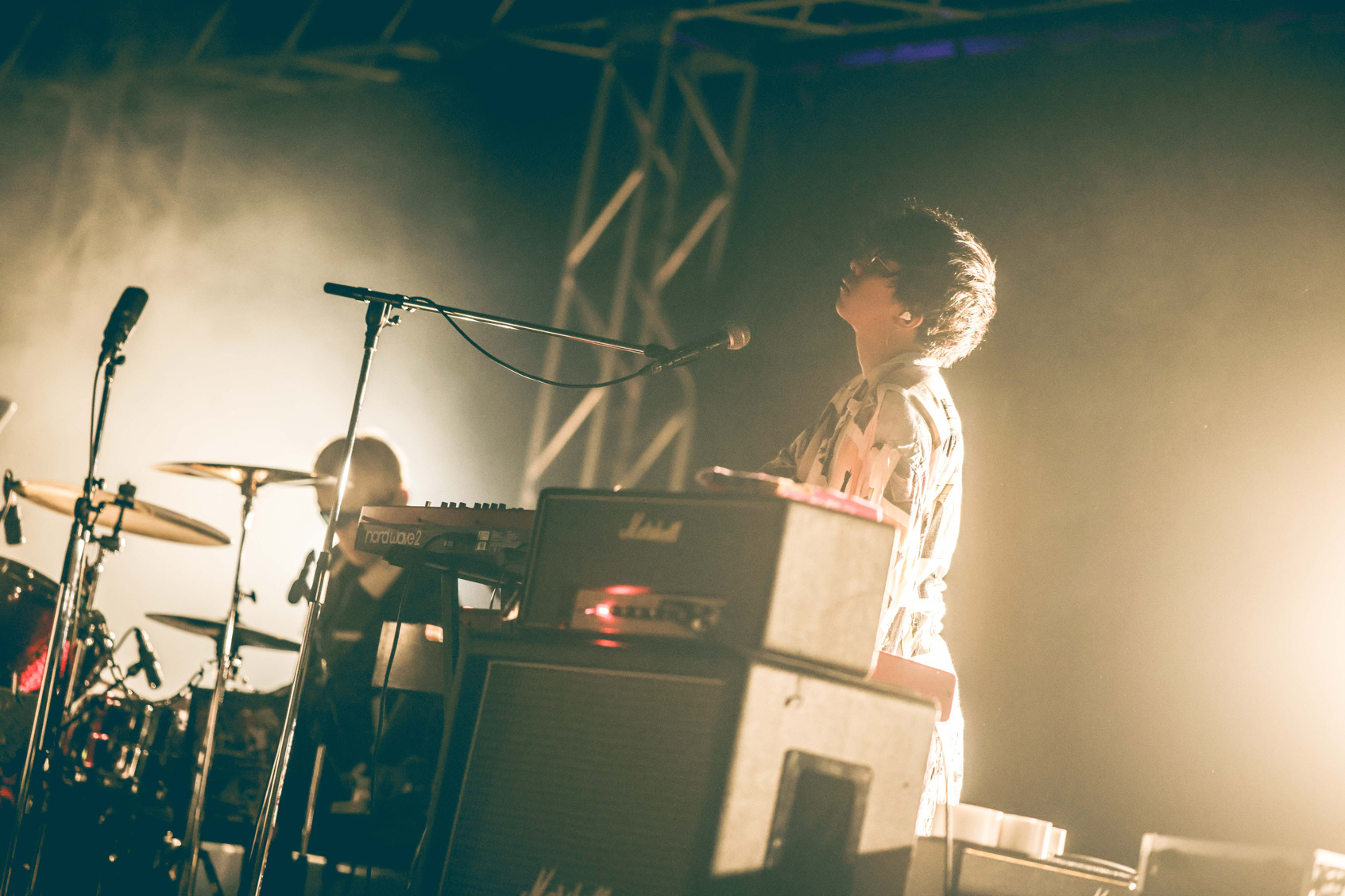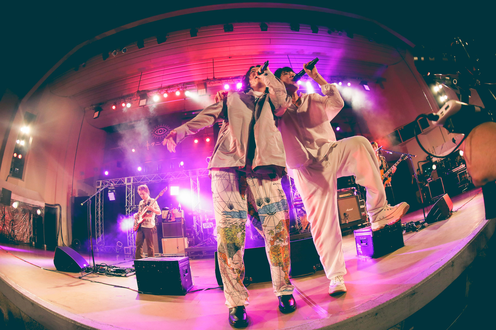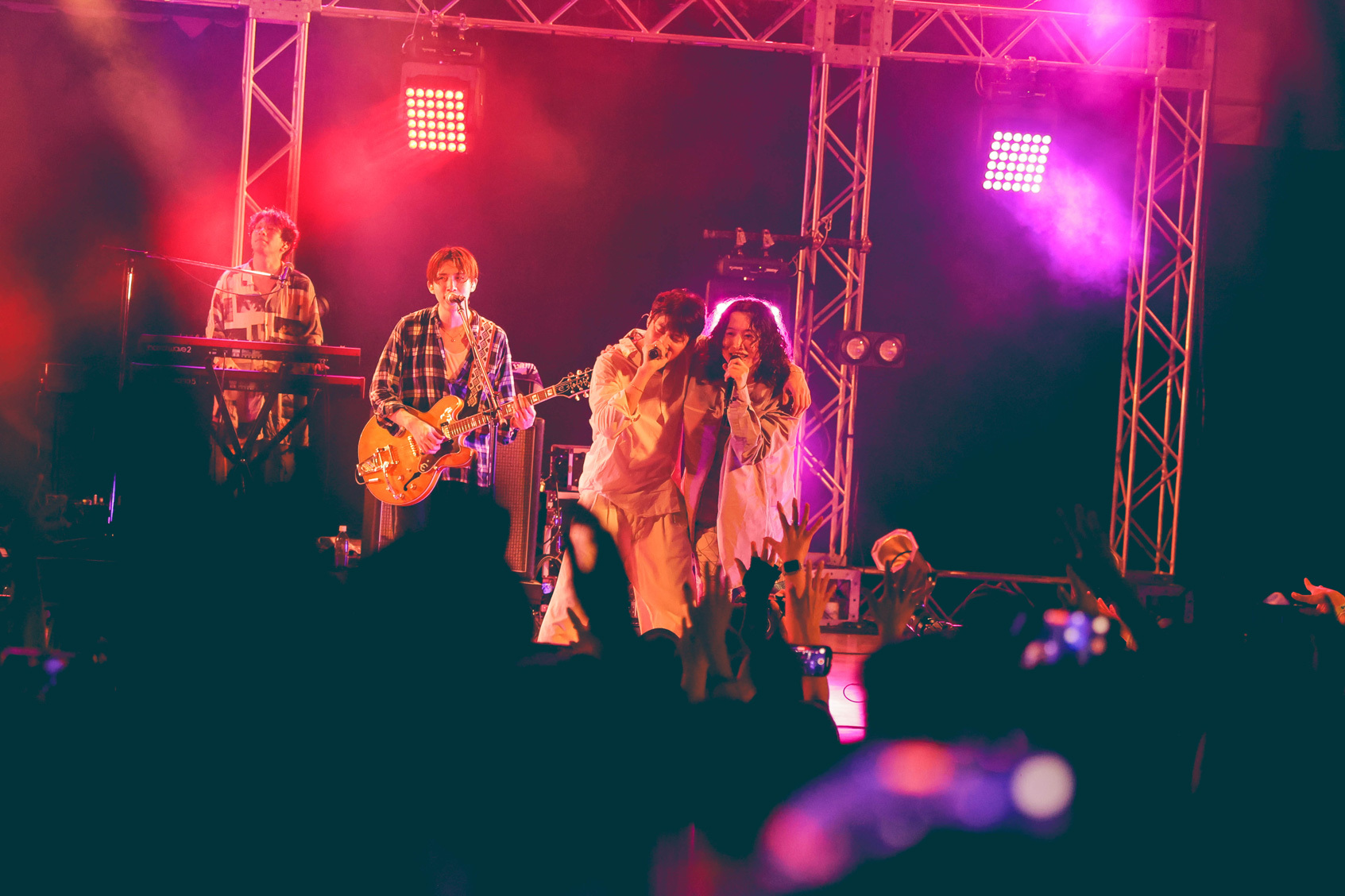 「こうやって野外で夜にライブできるって最高やな。野外で聴くんやったらアコギの音とかいいなと思って、そんな曲を持ってきてます。キタニくんとはこのイベントの対談をさせてもらってから一気に仲良くなって、一緒に飲んで、記憶をなくした仲です(笑)。今日のライブでさらにグルーヴを高めたいなと思ってますんで」(牧)