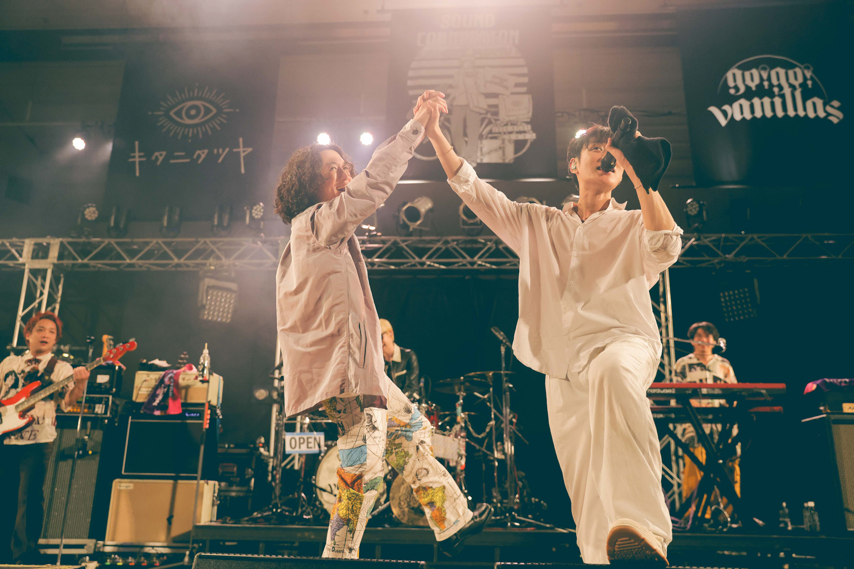 同イベントに向け、キタニタツヤ×go!go!vanillas牧 達弥(Vo.Gt)のスペシャル対談(https://spice.eplus.jp/articles/327894)が実施され、当日はペインター・SHUN NAKAOのイラストがあしらわれたイベント限定コラボTシャツや、イベントのロゴ入りタオルなどオリジナルグッズを販売(現在、GREENS公式オンラインショップで販売中!)。さらに、キタニの「Cinnamon」とバニラズの「SHAKE」と、両者の曲名をもじった限定ドリンク「シナモンシェイク」も販売されるなど、盛り上がる準備は万端。期待感で爆発寸前の中、いよいよライブはスタートした。