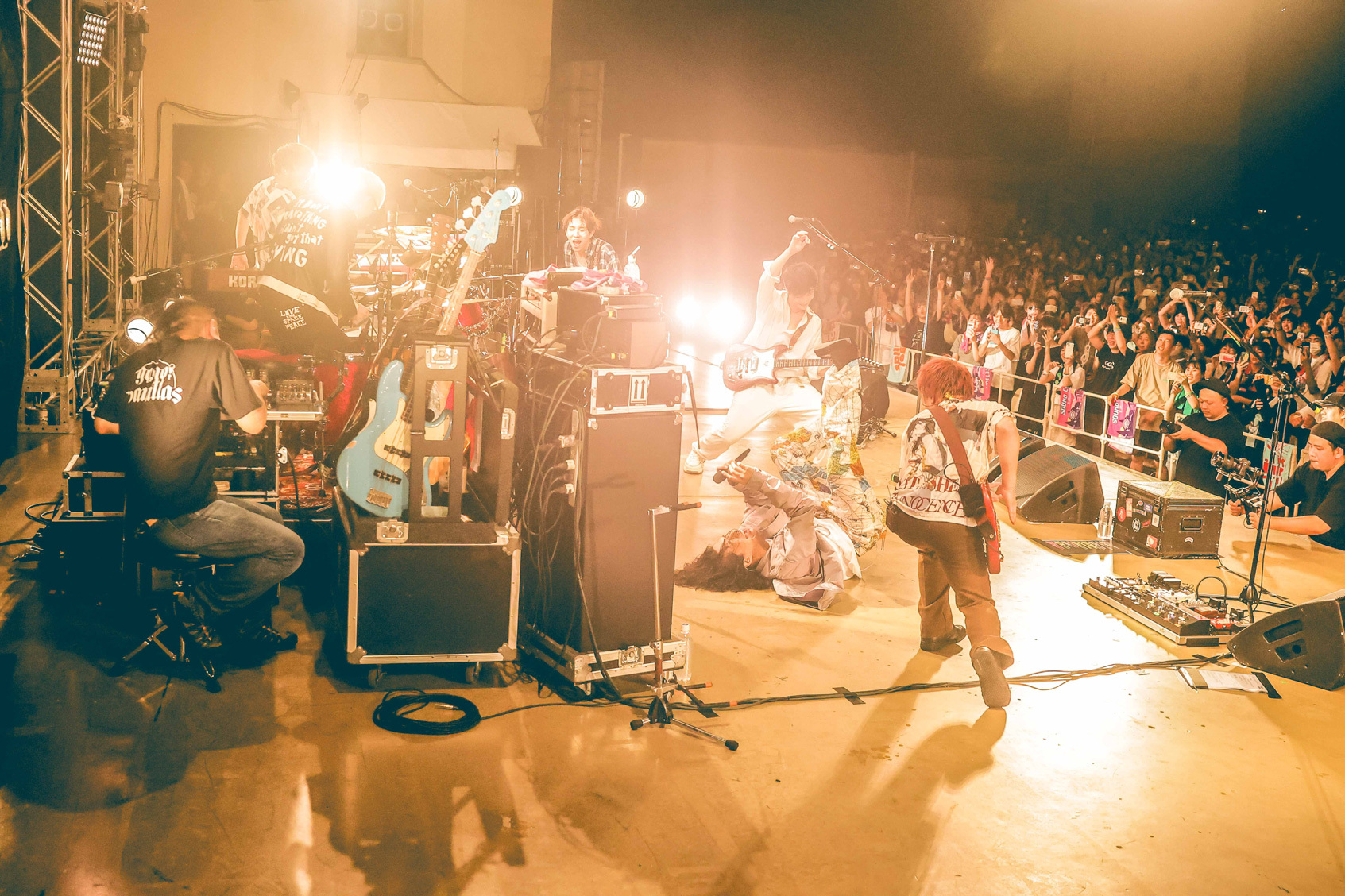 タイトルを地でいくような「LIFE IS BEAUTIFUL」では、歌詞の一節を<キタニタツヤとなら 大阪となら大丈夫>と変え、グッドヴァイブに心地良く浸らせたかと思えば、長谷川プリティ敬祐(Ba)が「めちゃめちゃ今日は暑い夜やけどさ、まだまだ熱くなれるか~!」と呼び掛けた有言実行の「平成ペイン」、からのライブ鉄板「エマ」では、見渡す限りが手を振りジャンプする絶景を創出。最高潮のテンションのままフィナーレを迎えた。