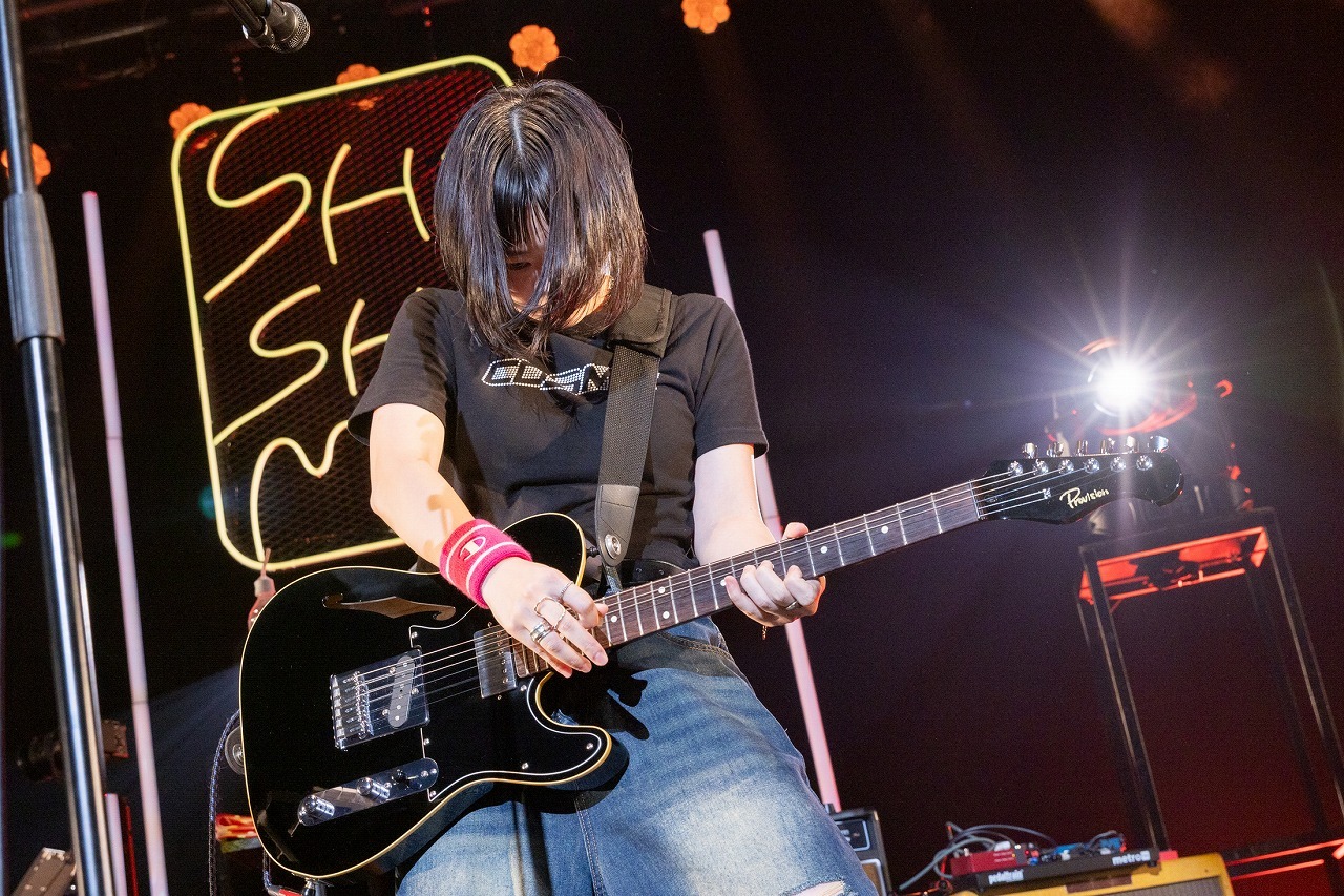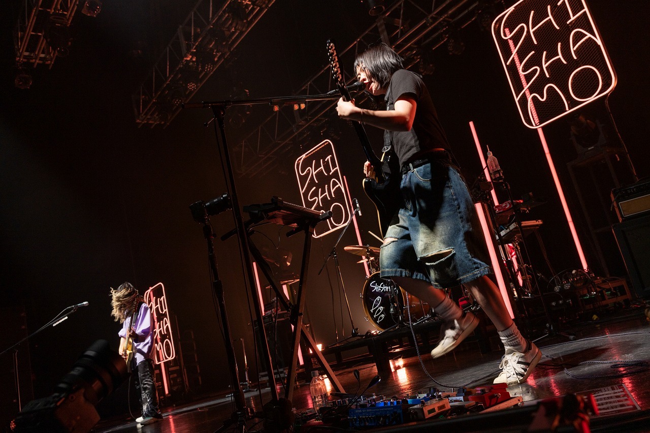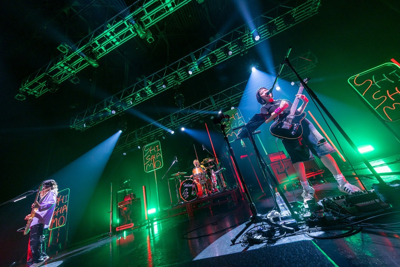 2024年6月30日、 東京 Zepp DiverCity(TOKYO)で『SHISHAMO ワンマンツアー2024初夏「退屈なハッピーエンドに迷い込んだのは君のせいだ」』の国内ファイナル公演(7月13日の台北公演が正式なファイナル)を観た。CDデビュー11年目のSHISHAMOは、さらに高い次元へとステップアップしていた。これまでの魅力を維持しながらも、新境地を切り拓いていたからだ。“新しいSHISHAMO”の予感は、会場に入った瞬間からあった。最新のアーティストヴィジュアルにもリンクするような「SHISHAMO」の文字を形取ったネオン管風の照明が設置されていたからだ。4月10日にリリースしたアルバム『SHISHAMO 8』の充実ぶりも、今回のツアーへの期待を高いものにしていた。