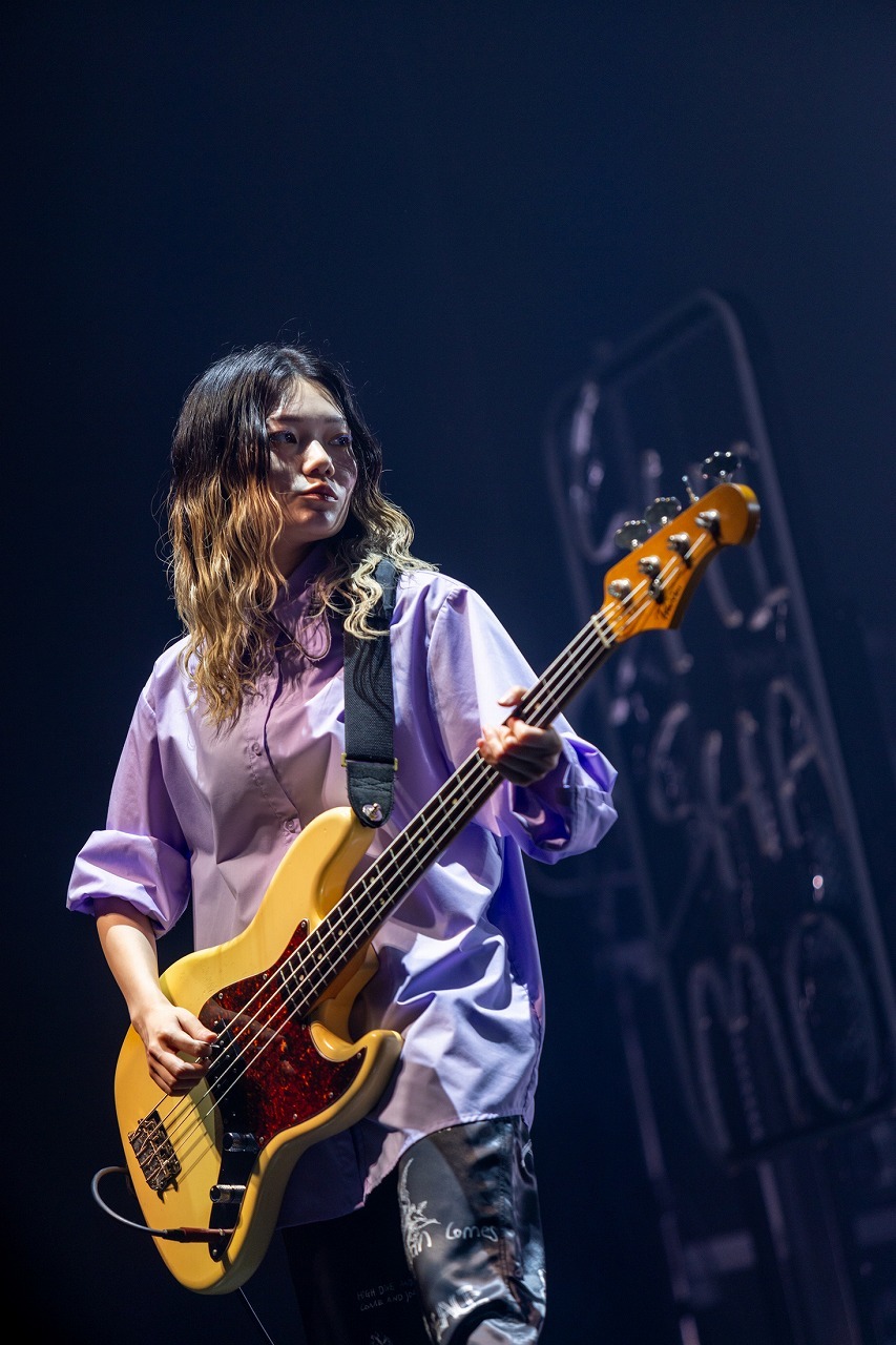 「ハリボテ」は宮崎のギターと歌での始まり。ハリボテの世界で恋人と2人で生きているというSF的な設定の楽曲の世界を、甘美さやシュールさの混じった歌と演奏で見事に表現していた。表現力の豊かさと解像度の高さを備えたバンドサウンドなのだ。密やかな恋心を繊細かつ緻密な演奏で見事に表現していたのは「なんとなく。」。歌心を持った3人のアンサンブルが見事だ。躍動感と開放感あふれる演奏に体が揺れたのは「わたしの宇宙」。観客がハンドクラップで参加している。温かさと力強さを備えた歌と演奏に、会場内が包み込まれていくようだった。