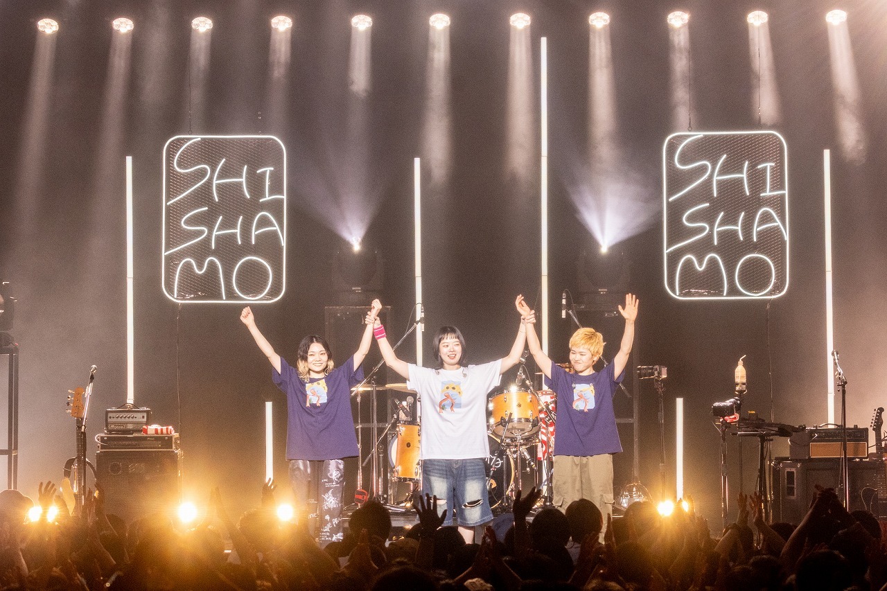 宮崎朝子(Gt,Vo)、松岡彩(Ba)、吉川美冴貴(Dr)がステージに登場すると、大きな拍手と熱烈な歓声が起こった。1階のスタンディングゾーンはぎっしり満員。この人口密集率の高さは、コロナ禍を乗り越えてきたことの証しでもあるだろう。オープニングナンバーは『SHISHAMO 8』収録の「会えないのに」だった。吉川がスティックでカウントを取り、宮崎が歌い始めた瞬間に、観客を一気に歌の世界へと引き込んでいく。松岡のドライブ感あふれるベースが気持ちいい。疾走感あふれる演奏でありながら、一つひとつの音のニュアンスが豊か。主人公のもやもやした思いまでもが鮮やかに伝わってくる。一転して、ほのぼのとした歌と演奏、キュートなコーラスが心地よかったのは「犬ころ」だ。素朴さを備えた演奏からは、日常の空気感までもが伝わってくるようだった。エモーショナルな歌声と演奏が染みてきたのは「私のままで」。曲の主人公にエールを送るような歌と演奏から、SHISHAMOの成長を感じた。3人はこれまで以上に深く楽曲の世界に踏み込み、より強く客席に向けて届けていた。冒頭から新曲が続く展開となったが、こうした“攻めたセットリスト”からは、最新アルバムに対するメンバーの手ごたえがうかがえる。MCでも3人それぞれからこんな言葉があった。
