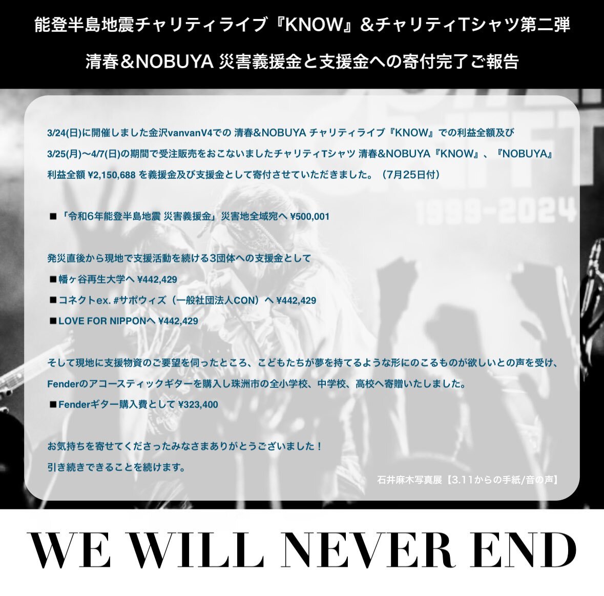 令和6年能登半島地震への支援として、3月24日(日)に開催された、金沢・vanvanV4での清春(with 大橋英之)&NOBUYA(with MASAHIKO)のチャリティライブ『KNOW』での利益全額及び、3月25日(月)~4月7日(日)の期間で受注販売されたチャリティTシャツの利益全額 ¥2,150,688を義援金及び支援金として寄付が完了したことを、写真家・石井麻木が報告した。