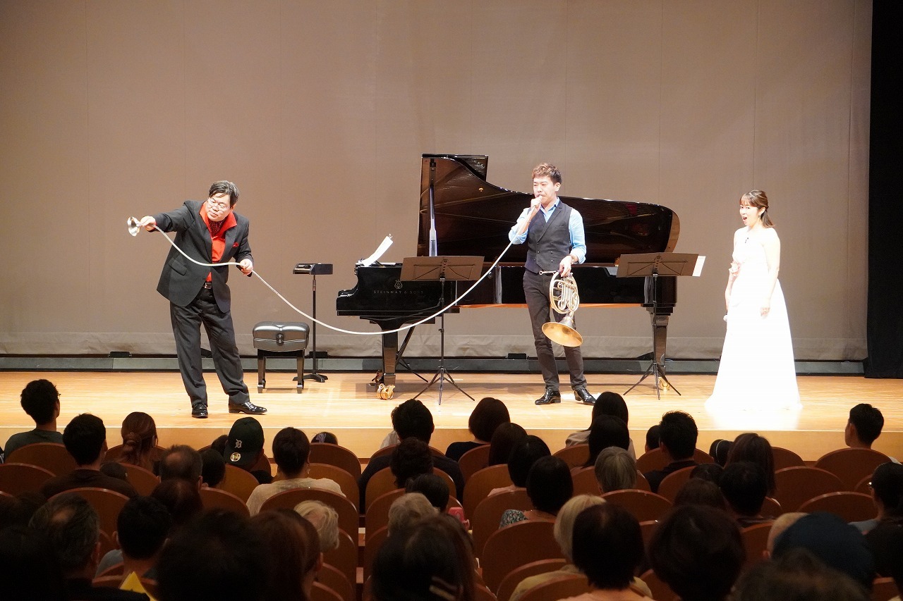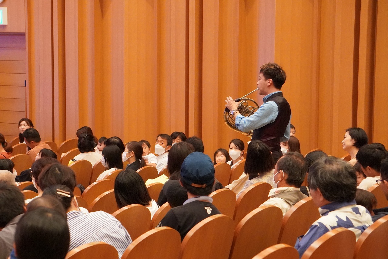 山々を吹き抜ける風のような、爽やかなホルンの響きとともに、客席の後ろから突然福川さんが登場! どこから音が聞こえてくるのかな? お子さんたちはまわりをキョロキョロ、見つけた時はとっても嬉しそうでした。