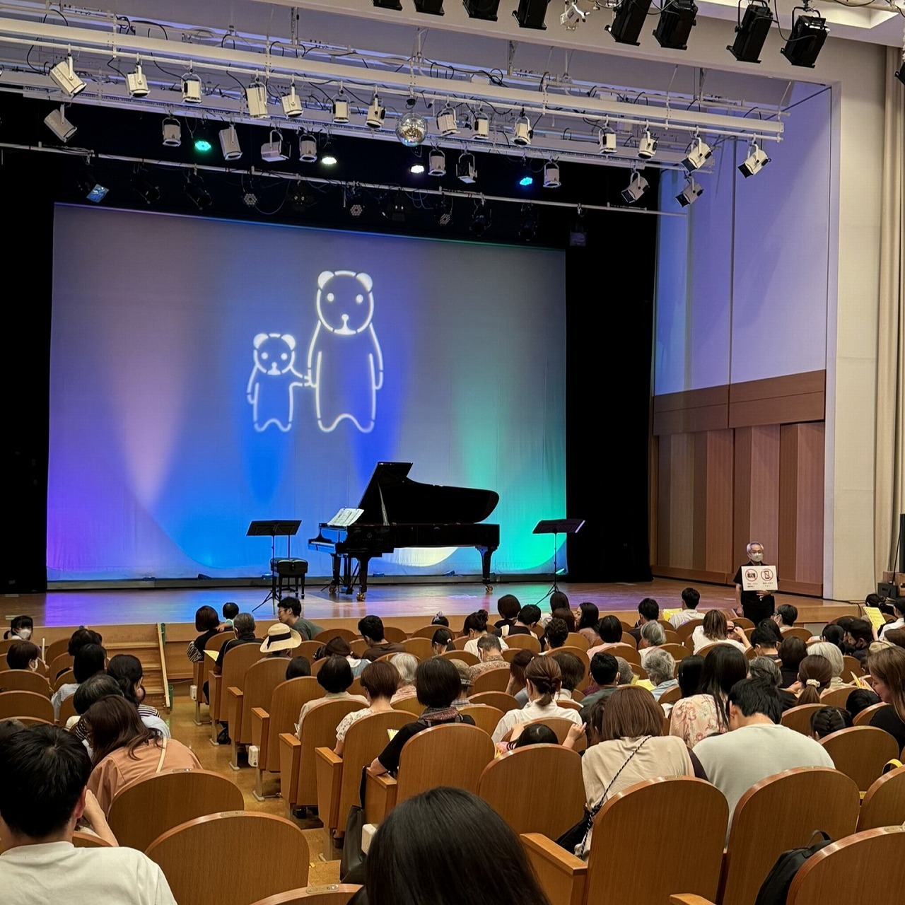 ホールの中に入ると、今度はステージに投影された可愛いキャラクターがお出迎え。あの動物は何かな? 親子なのかな? 兄弟なのかな? 開演の前から、そんな親子の会話が聞こえてきます。