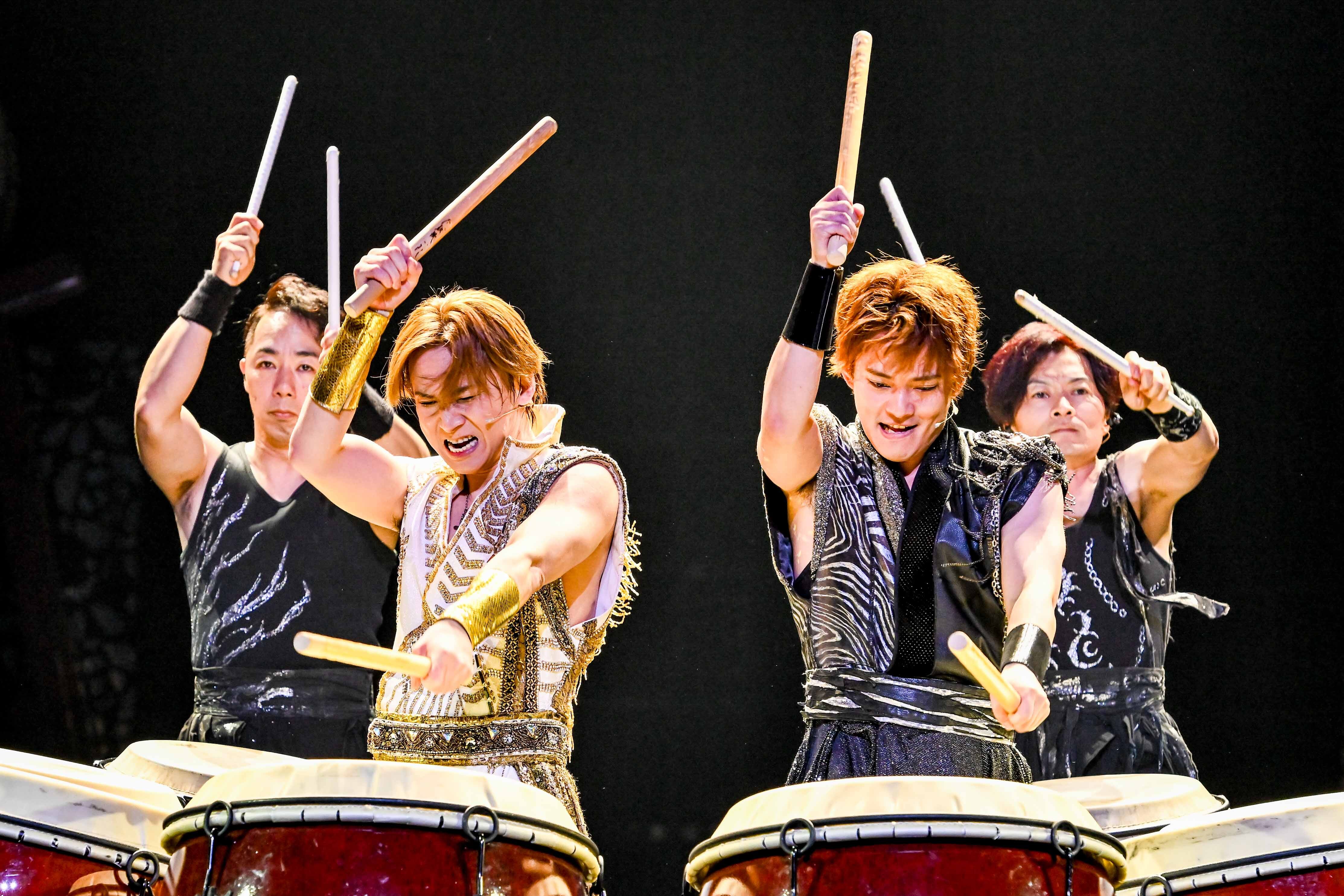 第二幕では、劇中劇であるシェイクスピアの名台詞が次から次へと劇場を埋め尽くし、同時にイリュージョンやダンス、アクロバットも見せる。そんなふうに全編を通してショーのすべてがここには詰まっている。第二幕の中盤では、コウイチがコミカルな言動で和ませる場面もあり、ホッと一息……と思いきやクライマックスに向けて彼らの勢いは猛スピードで加速していった。コウイチとユウマによる和太鼓では、緊迫感の中で二人が息の合った連打を見せる。やり終えるとユウマに笑顔を向けるコウイチ。二人はがっちりと固く握手をして称え合った。また、コウイチがフライングで空中パフォーマンスを見せる中、ユウマらはステージで太鼓を披露。全員の一糸乱れぬ撥さばきに、このカンパニーの結束力の強さを見た。