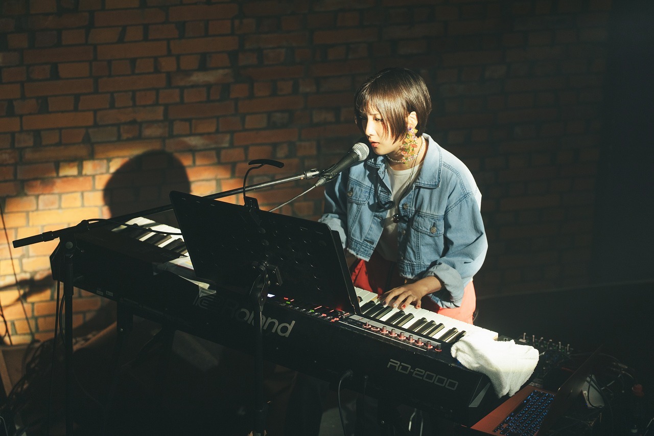 パーカッションのヒロシと二人で披露した「金魚」は、本番前にどう演奏するのか決めないで、純粋にセッションを楽しむ。美しく儚い春を描いた「春に僕はなくなる」は、キーボードのベントラーカオルと二人で披露。キーボードを弾く手元だけにスポットが当たる光の演出に引き込まれる。