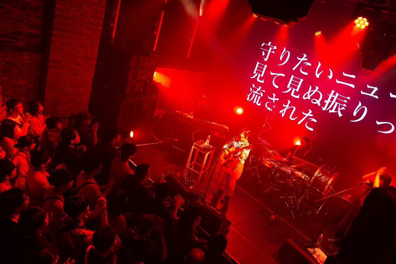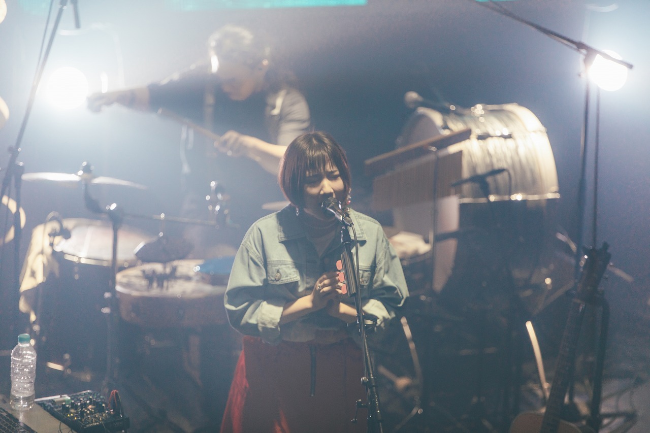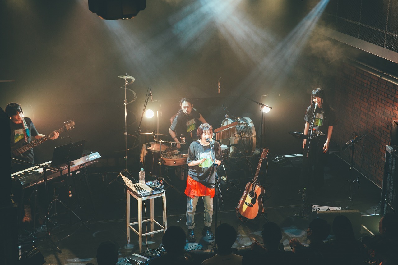久々にライブができる歓びからか、この日の湯木は最初からテンションが高かった。「本当の自分を曝け出してる。私、変なコなんです」と語ると、客席も笑顔だ。キーボードとパーカッションとアイコンタクトを取りながら楽しそうにセッションを楽しむ「網状脈」、そしてバンドが全員揃い「選択」を歌った。コーラスが重なり、繊細で強いメロディを乗せ《愛と苦しみと明日を、選ぼう。》という言葉を一人ひとりの心に運ぶ。