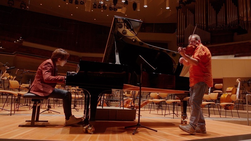 中村:そうですね。 そこはアイデアが豊富な石井さんらしく、ウィーンでレコーディングをされている頃に閃かれたようで、私のところに青木さんからメールがあり、「無理を承知で申し上げるのですが、YouTubeチャンネルの企画として、リハの後とかにフィルハーモニーザールのステージで、オケのメンバーのどなたかと共演できないか」と。日数もなかったのですが、オケの方でも面白がってくれまして、リハの前半でピアノが出ているから、その直後つまりリハの休憩時間なら、ということでうけてくれました。