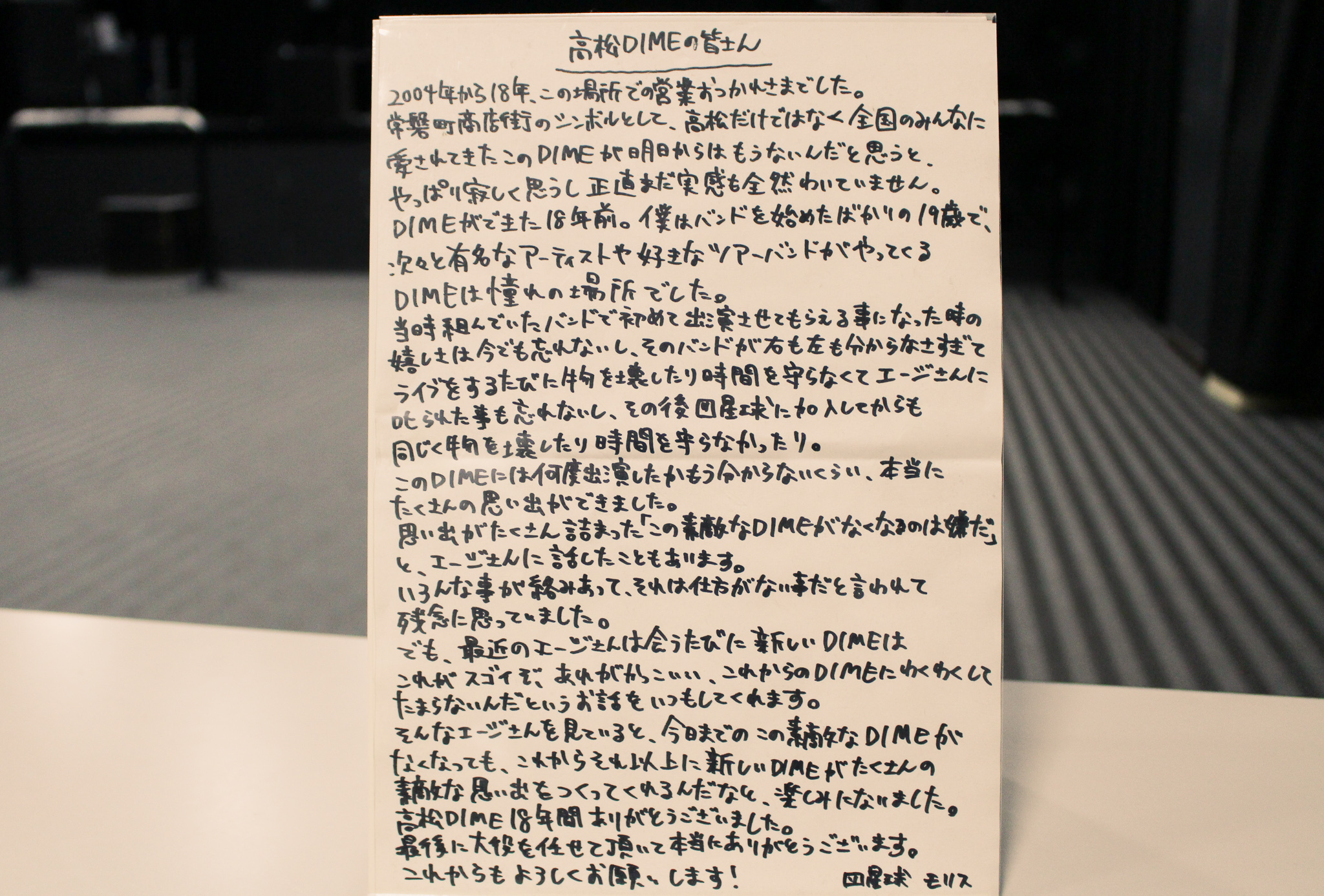 今年61歳なんですけど、車いすに押されながらでも観に来ようかなと。引退なんて考えてないし、目の見える内はライブハウスを観ておきたい。現場を観ているのがおもしろいから。ここDIMEを維持して残していくのが最大の目標。同じバンドを好きならば、歳の差の垣根を越えられるしね。10代の子とも普通に話せて、気分が若返るから。若い子と話していると、負けてられへんとも思うし。まぁ、都会がやっているものをそのままやっても仕方ないし、みなさんのアイデアを聞きながら、こちらのやり方でやっていきますよ。