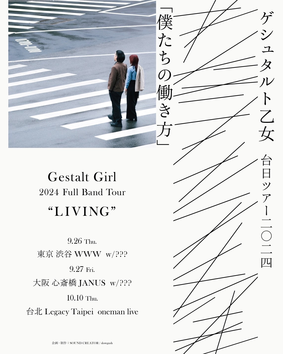 『ゲシュタルト乙女 台日ツアー2024 “僕たちの働き方”』は、東京は9月26日(木)渋谷 WWW、大阪は翌日の9月27日(金)心斎橋 JANUSにて開催。ツアーファイナルは、10月10日(木)に台北・Legacy Taipeiでのワンマンライブとなる。チケットは一般発売中。