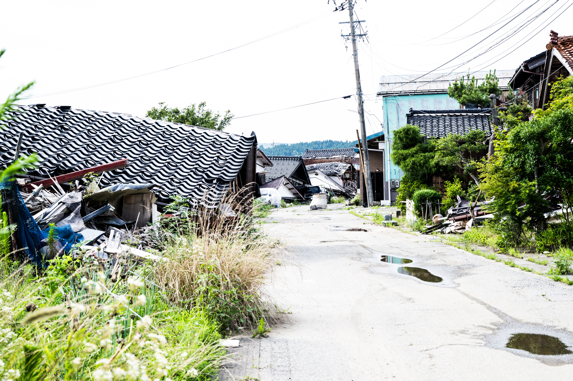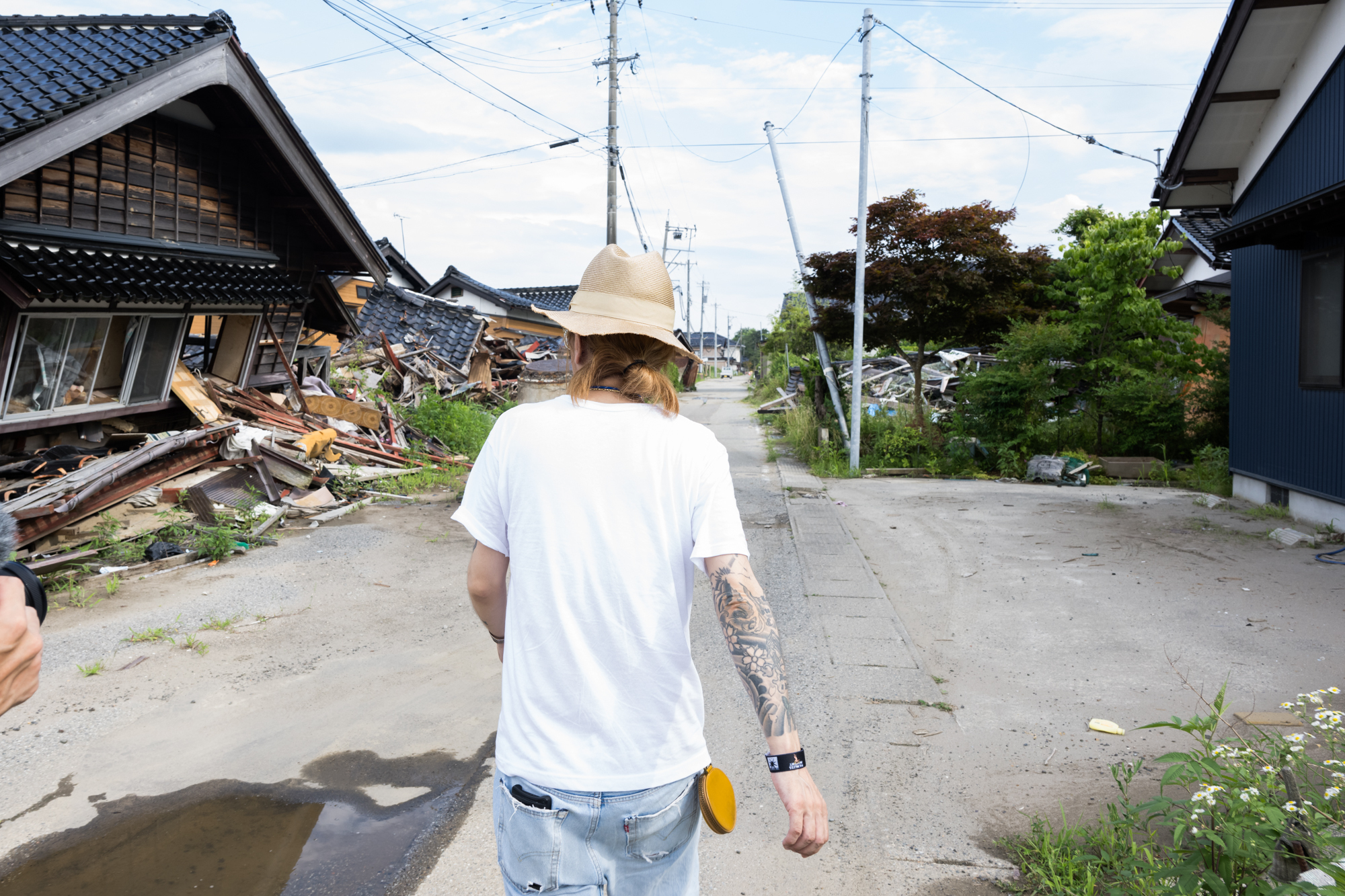 ライブ会場のいやさか広場に向かう前には、珠洲市宝立町鵜飼周辺を視察。ここは約3mの津波が街を襲った地域だ。清春と石井は前回もこの場所を訪れている。3月はもう少しゴーストタウンだった、と教ちゃん。この日は車通りもあり、瓦礫撤去の重機の音が聞こえ、畑では農作業をしている人の姿も見られた。