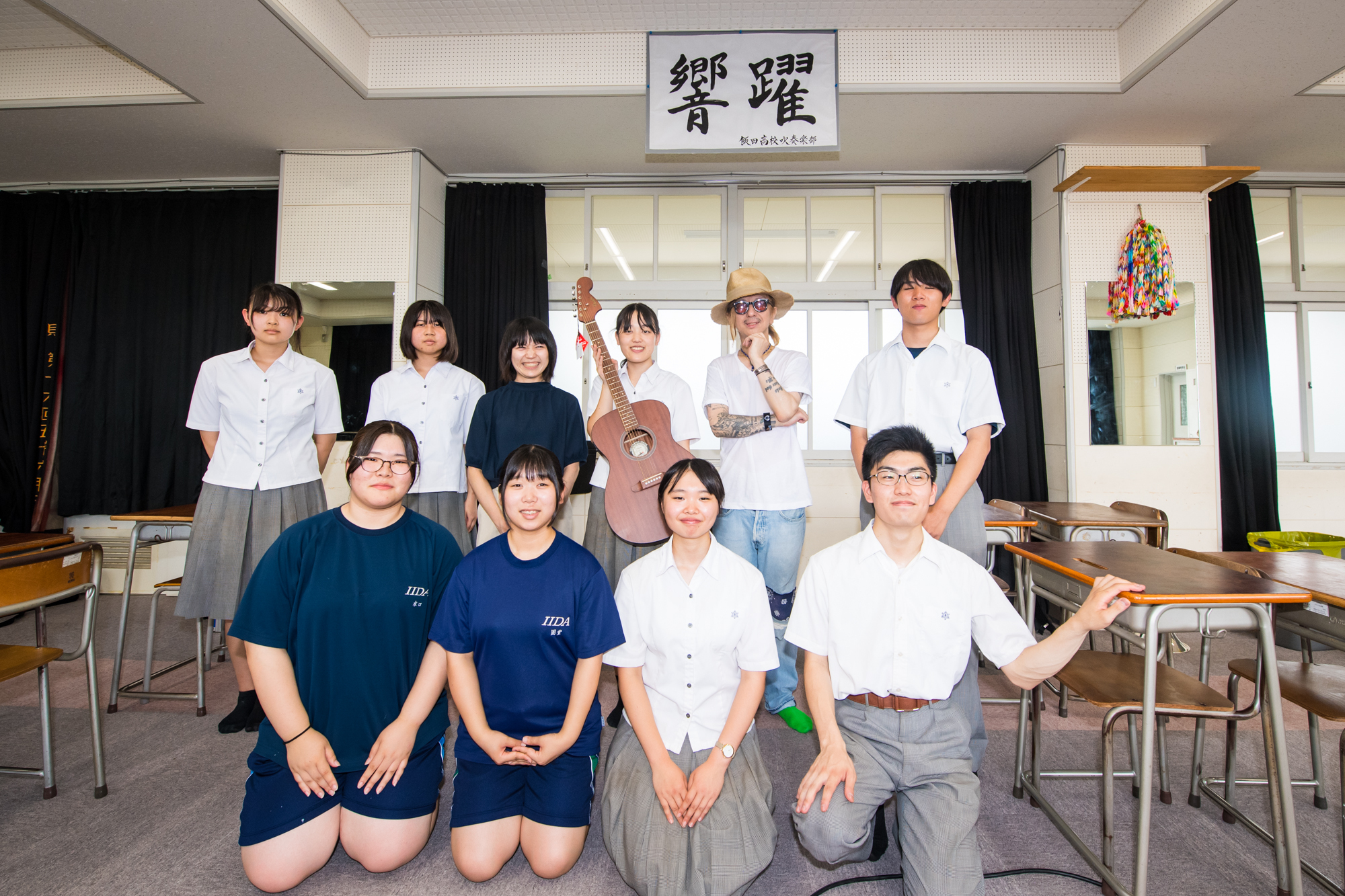 まずは飯田高校の吹奏楽部に到着。出迎えてくれたのは16〜18歳の8人の部員と先生だ。早速部長の学生にギターが手渡され、ぴかぴかのアコースティックギターを見た学生は「すごい! かっこ良い! 綺麗!」と目を輝かせる。2人の子の父である清春は優しい眼差しでその様子を見つめ、「みんなのお父さんお母さん世代が、僕のこと知ってると思う。これを進呈します。ぶっ壊してください(笑)」とロック魂も継承した。