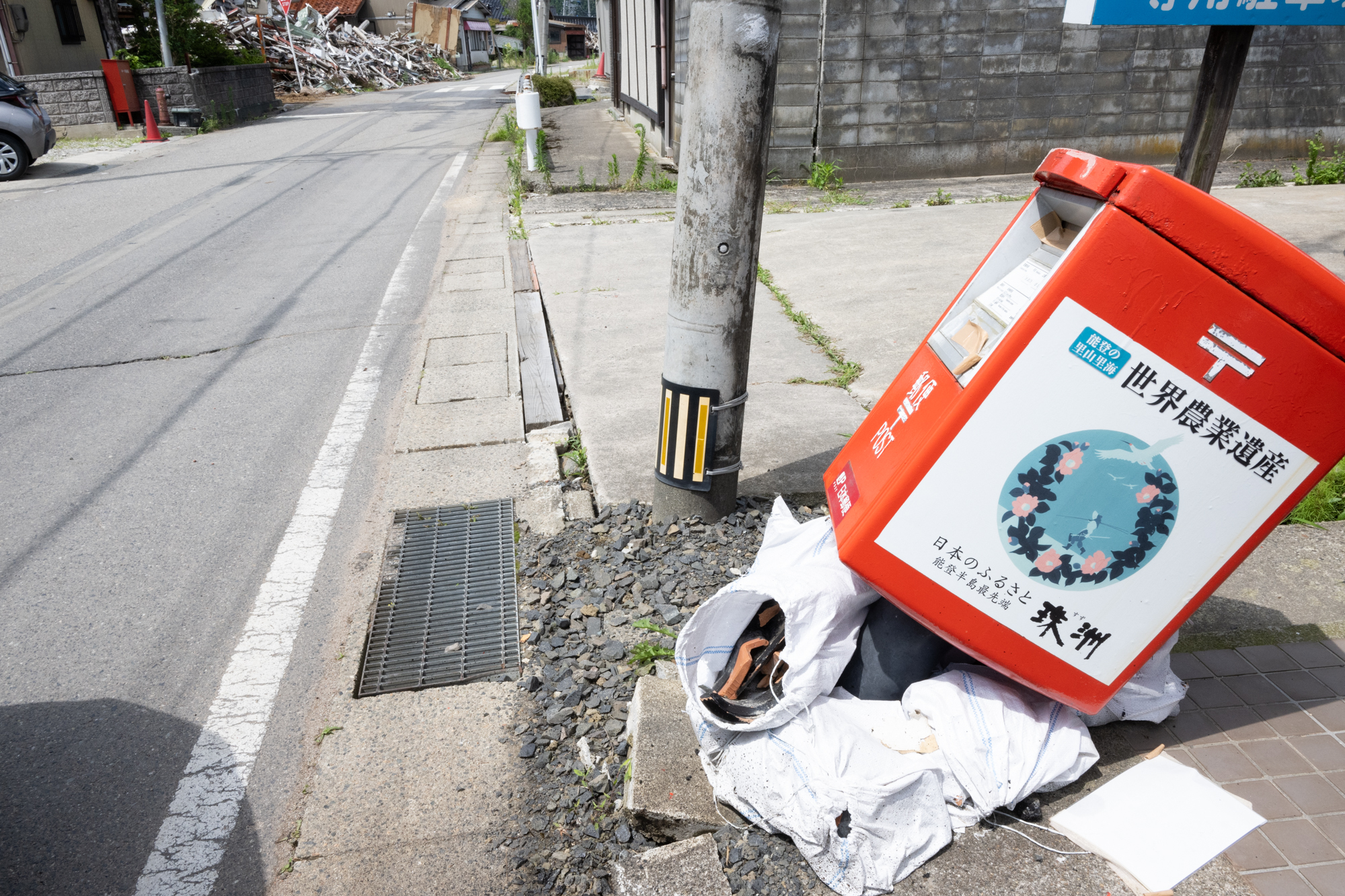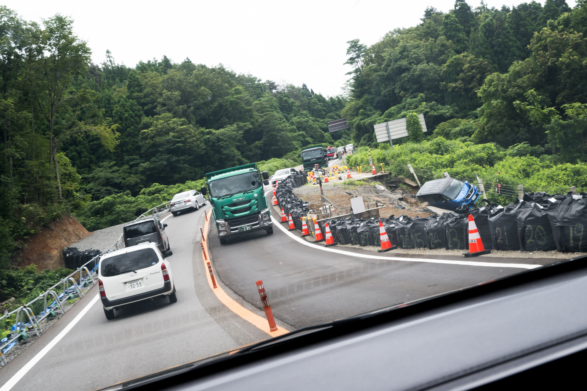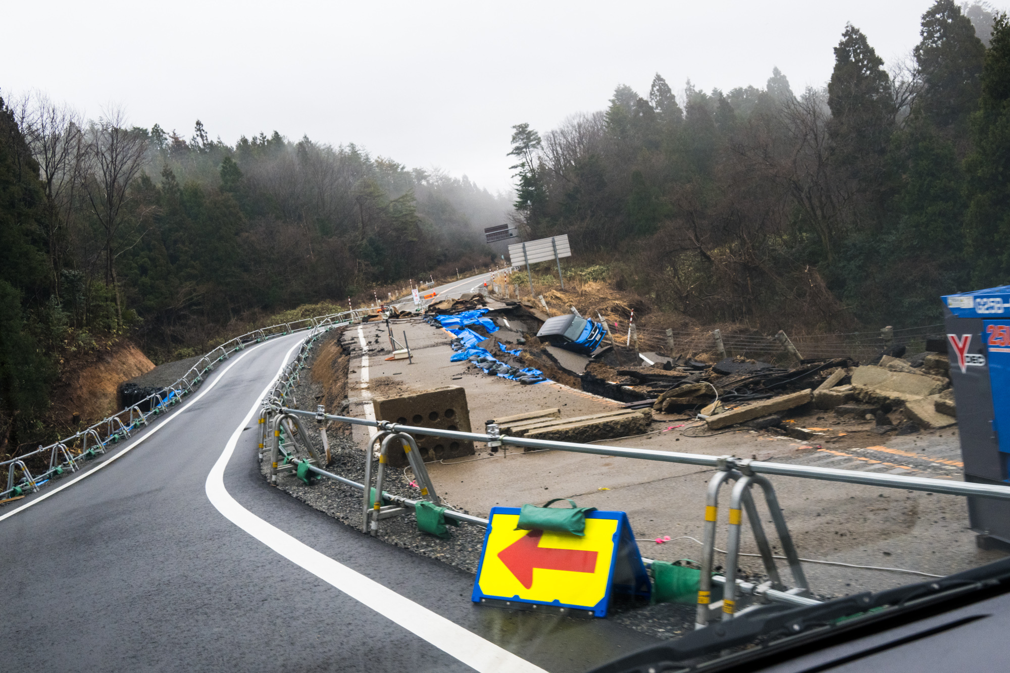 金沢市と能登を結ぶ自動車専用道路「のと里山海道」は「能登への大動脈」と呼ばれる。住民の暮らしにも欠かせない大事な交通網だ。道すがら教ちゃんに話を聞くと、もともと能登半島は地形的に迂回路が少なく、地震でこの大動脈が被災したことで道路が寸断し、初動対応が大幅に遅れてしまった。その後懸命な復旧作業で、3月15日に能登方面全区間の通行が再開。さらに7月17日正午からは、ほぼ全区間で対面通行が可能となった。3月時点は亀裂や段差で路面はボコボコ、一車線通行だったそうで、清春は「道路が綺麗になって良かった。食料とか持っていけるから。素晴らしい」と嬉しそう。しかし地震の爪痕は深く、ところどころで見かける崩落現場や亀裂が、揺れのすさまじさを物語っていた。
