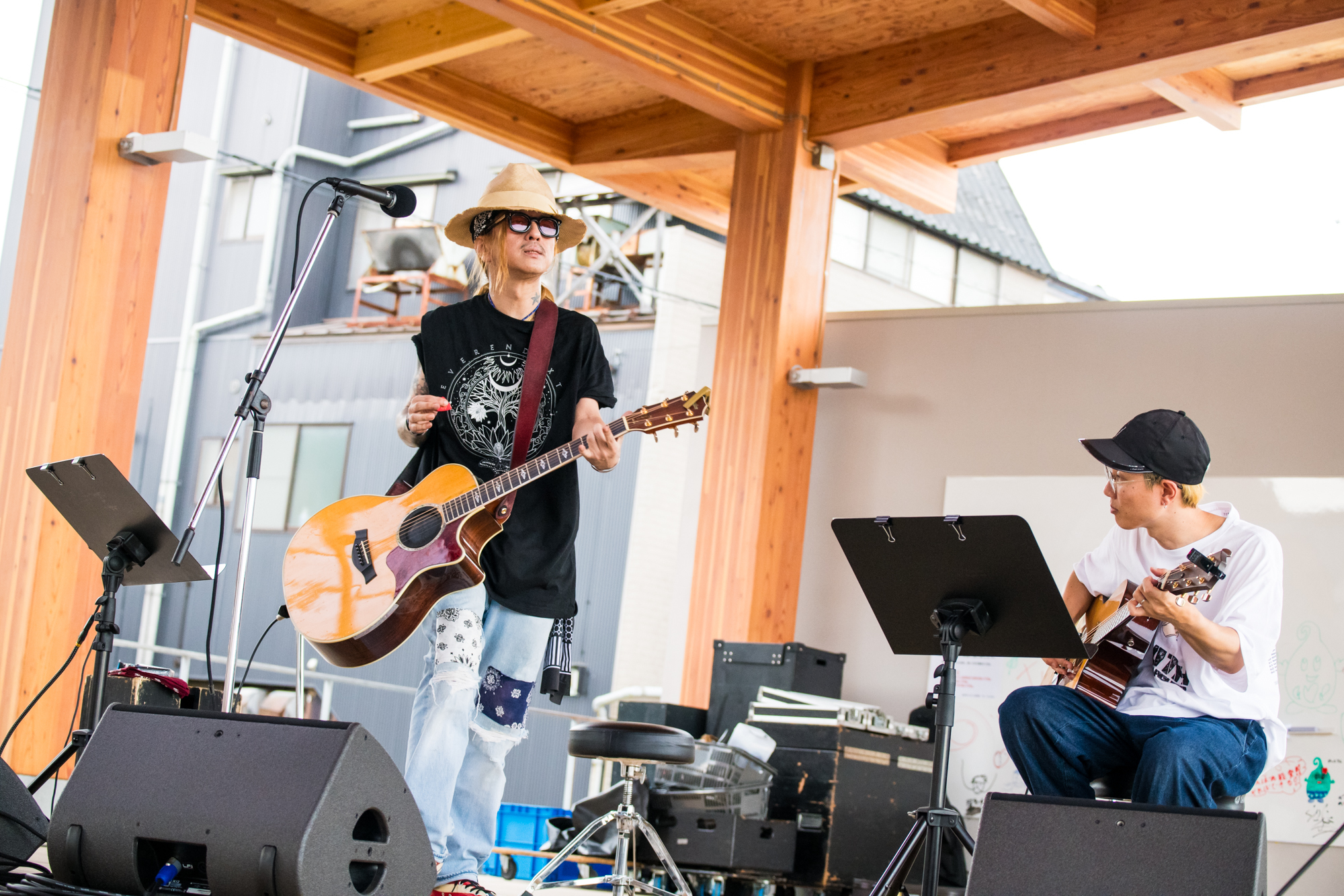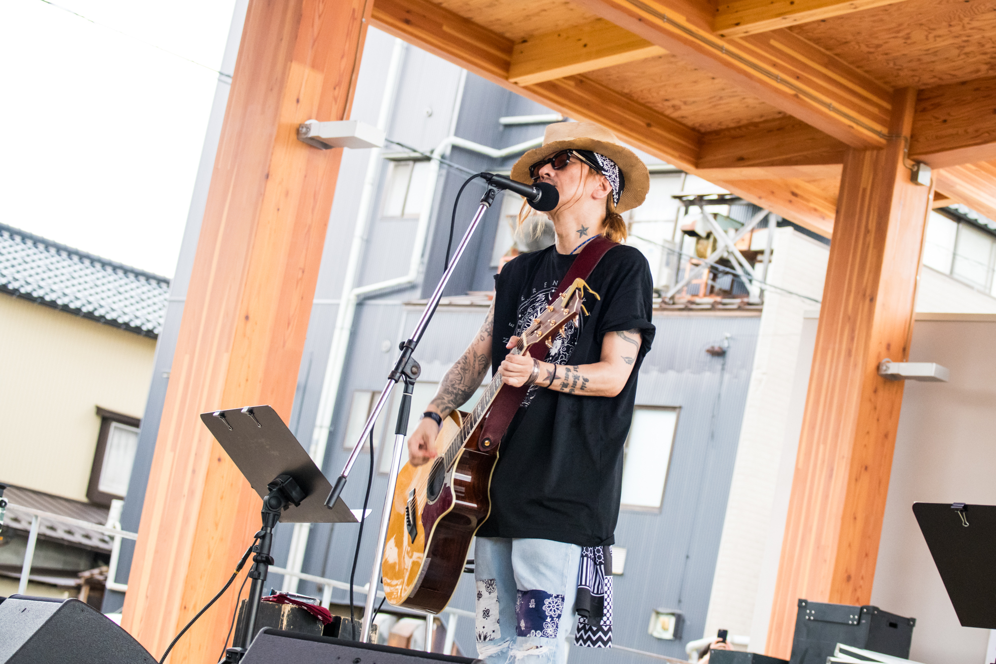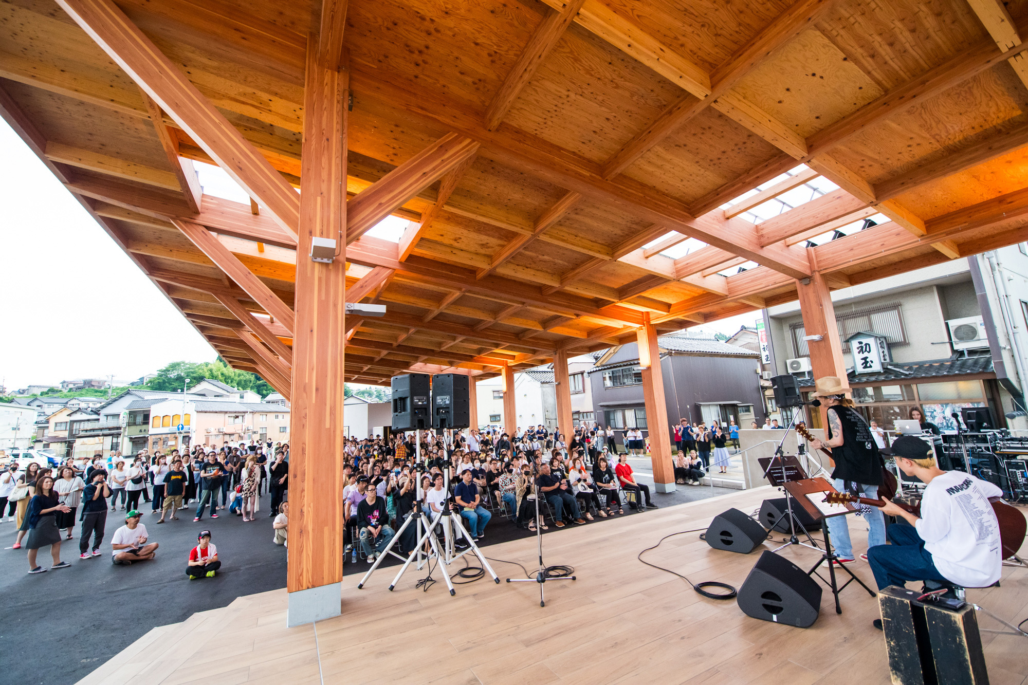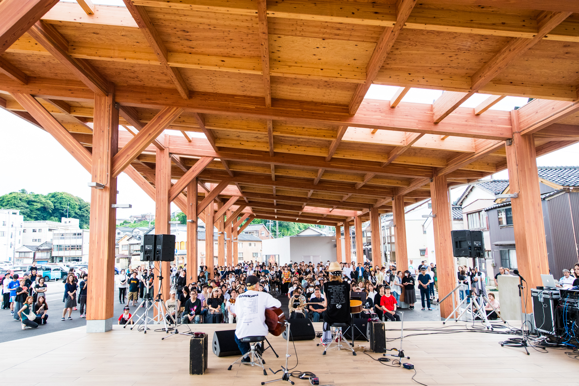 そしてお待ちかね、いやさか広場でのチャリティライブ。いやさか広場は、能登町宇出津港に面した敷地面積1347㎡のイベント広場。シンボル的な大屋根は、7月5日・6日に行われた宇出津のお祭りで、石川県の無形民俗文化財にも指定されている「あばれ祭り」の開催前に完成したばかり。ステージ前に並べられた椅子はすっかり埋まり、立ち見も出て大盛況。おじいちゃんおばあちゃん、学生や子どもたち、仕事を終えて駆けつけた人、ボランティアで能登町に滞在している人、県外からやってきた清春ファン。中には東北ライブハウス大作戦のTシャツを着ている人の姿も。およそ300〜400人の人たちが集まり、広場の空気は期待に高まっていた。