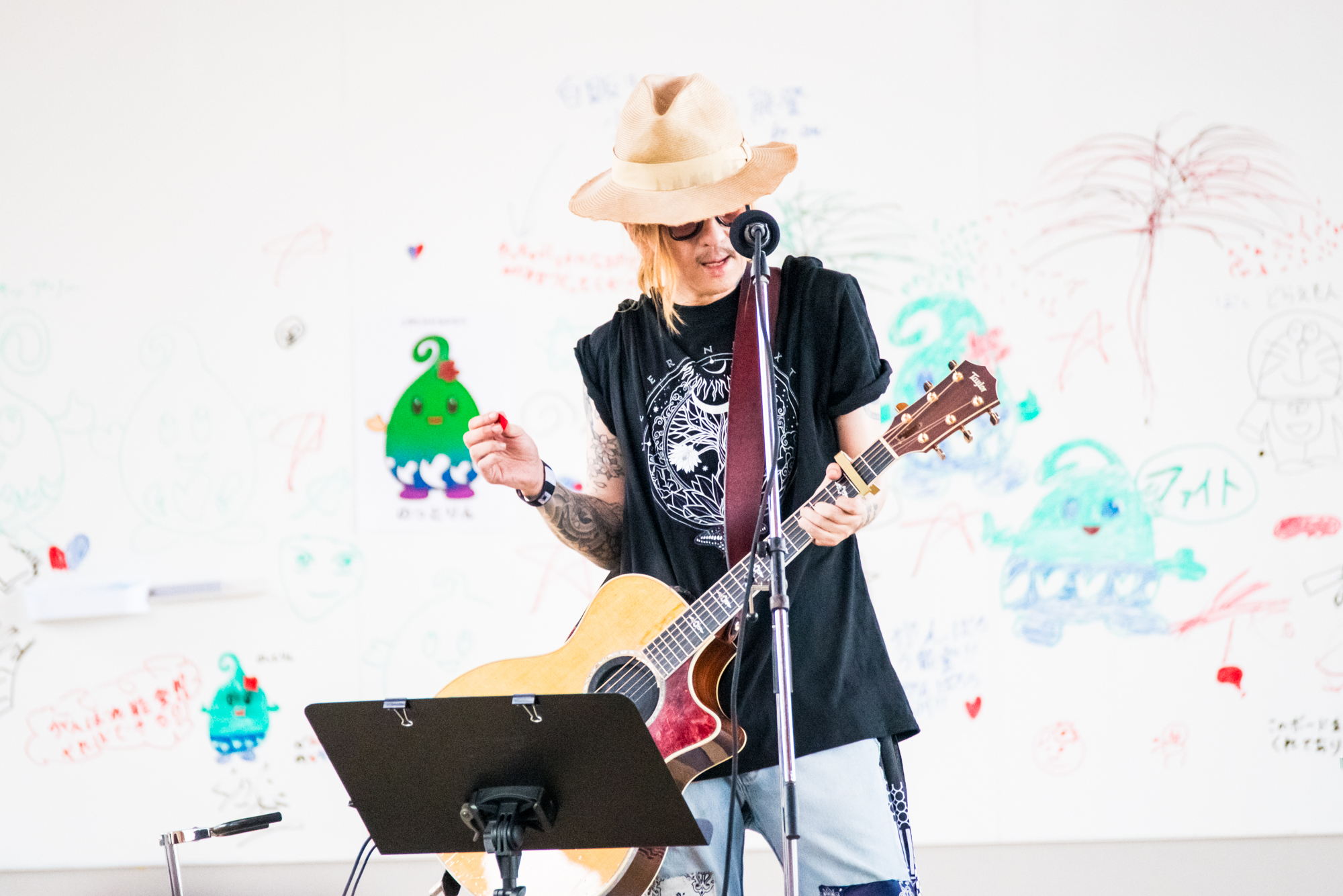 空き商店を改造した10畳ほどのスペースには、老若男女が満員御礼で清春を待ち構える。少し遅れて到着した清春を拍手で迎えると、ツアーのバンドメンバーでもあるギタリスト・大橋とのアコースティックライブがスタートした。