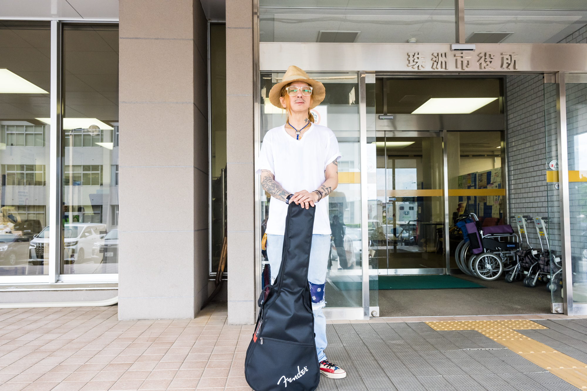 続いて、珠洲市役所の中にある教育委員会へ。清春はギターを渡すと同時に北國新聞社の取材もこなし、今回の能登訪問とギター贈呈への想いを話していた。