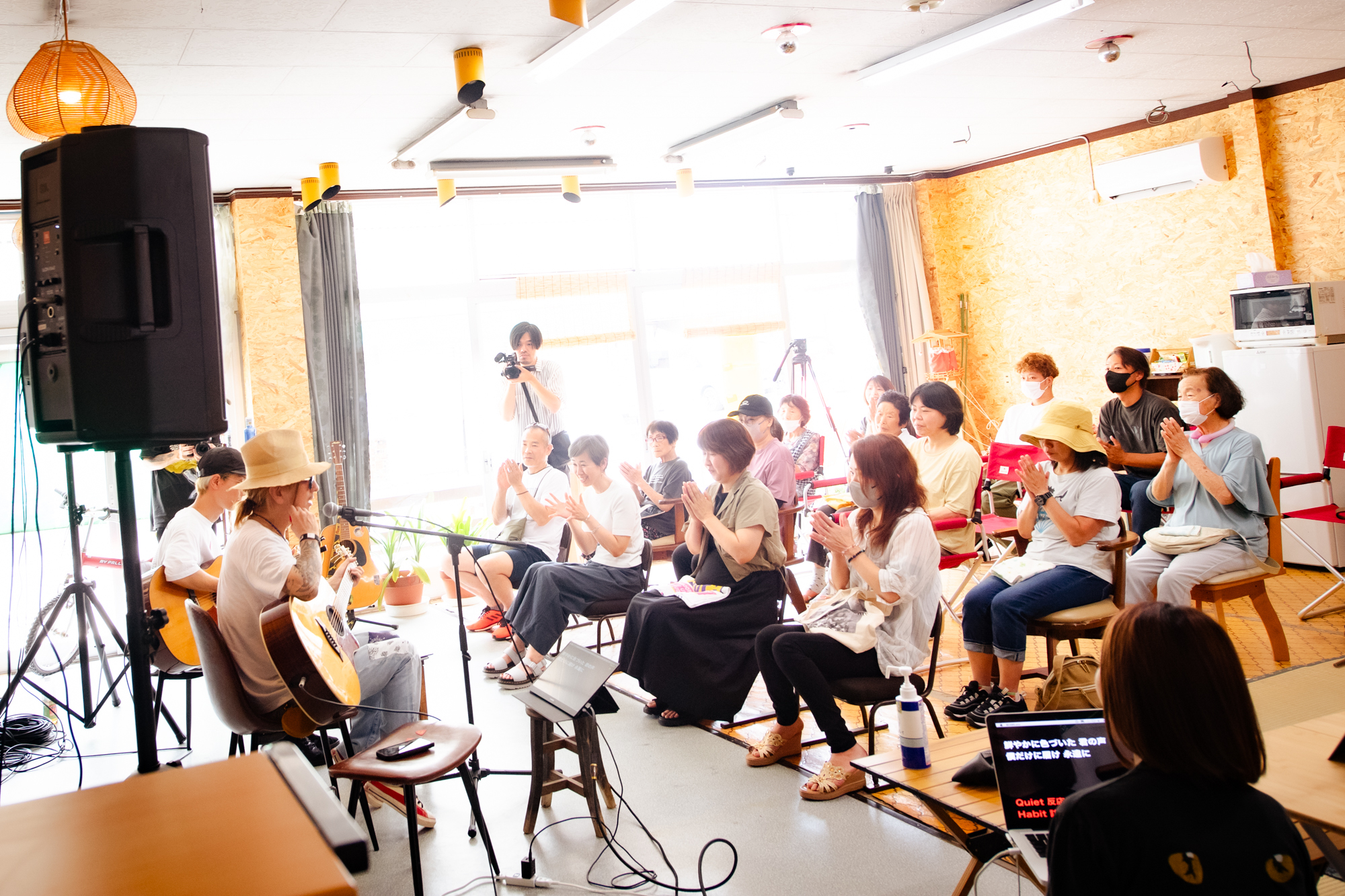 炊き出しが終わると、避難所から徒歩約5分の場所にある、本町ステーションでミニライブ。本町ステーションは、珠洲市の若手がNPO法人を立ち上げて作ったコミュニティスペースで、古着やお菓子を用意したり、さまざまなイベントを企画して誰もが気軽に立ち寄れる場所を作っている。また、震災後に営業を再開したサービスやお店、トイレの場所などの最新情報を更新するサイト「ファイト! 珠洲」も運営している。
