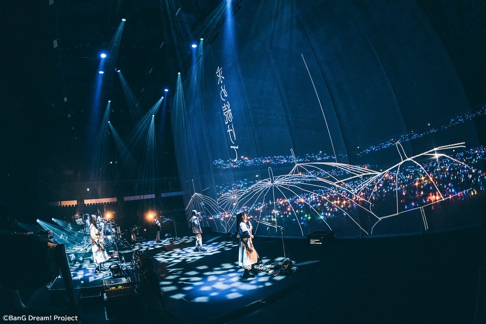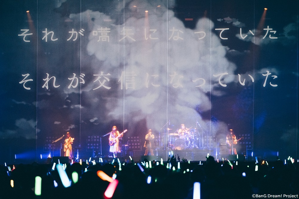 紗幕には続いて乾いた大地が映し出される。MyGO!!!!!の5人が力強いミドルテンポのサウンドを会場に駆け巡らせる。「無路矢」、その響きに合わせて青いペンライトは緩やかに揺れる。さらにここにアーバンなサウンドが響く。続いてのナンバーは「回層浮」。燈が響くサウンドに次々と言葉をはめ、オーディエンスを魅了する。そのパフォーマンスは、聴く者全てをMyGO!!!!!の世界へと引き摺り込む力があった。