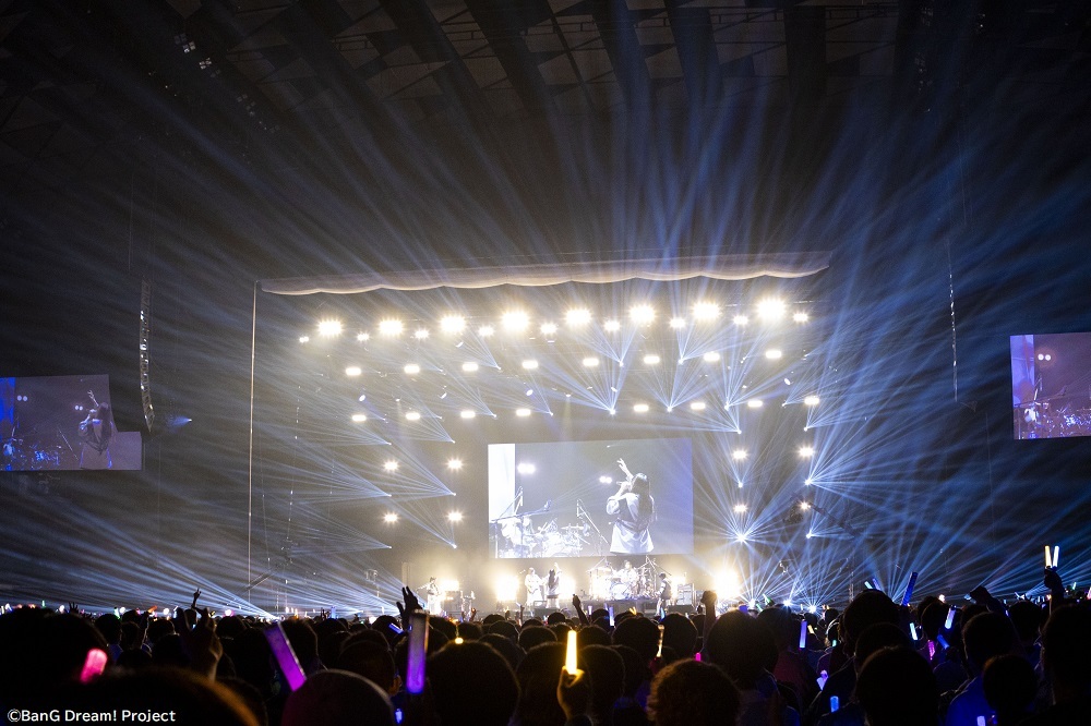 そして走り出したのは「砂寸奏」。華麗なセッションに燈のハイトーンな歌声が乗る。青木陽菜演じる楽奈が燈と絡みを見せ、会場を視覚的にも高揚させる。さらにここに間髪を入れず「迷路日々」が続く。緩急ある曲展開で会場の空気を見事に掌握するMyGO!!!!!。曲の締めくくりには燈が掲げた拳をそっと胸にあてる。オーディエンスたちはその姿に大きな歓声を送った。