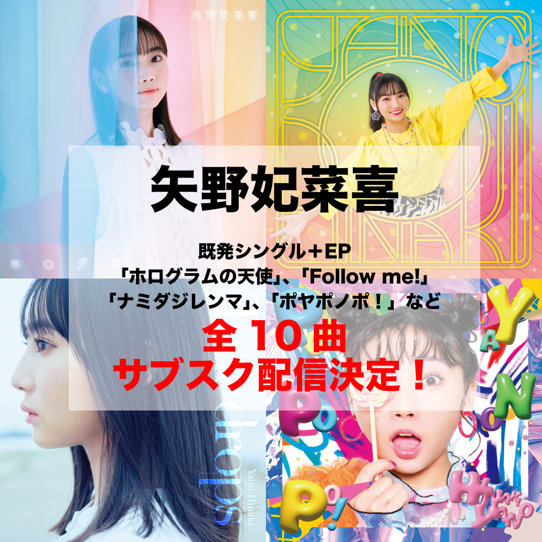 さらに「ホログラムの天使」、「Follow me!」、「ポヤポノポ!」など、これまでにリリースされてきた矢野妃菜喜の楽曲全10曲が8/2(金)よりApple MusicやSpotifyなどのサブスクリプションサービスで一挙解禁された。同日20:00には「ポヤポノポ!」ライブ映像がYouTubeでプレミア公開されることも決定した。