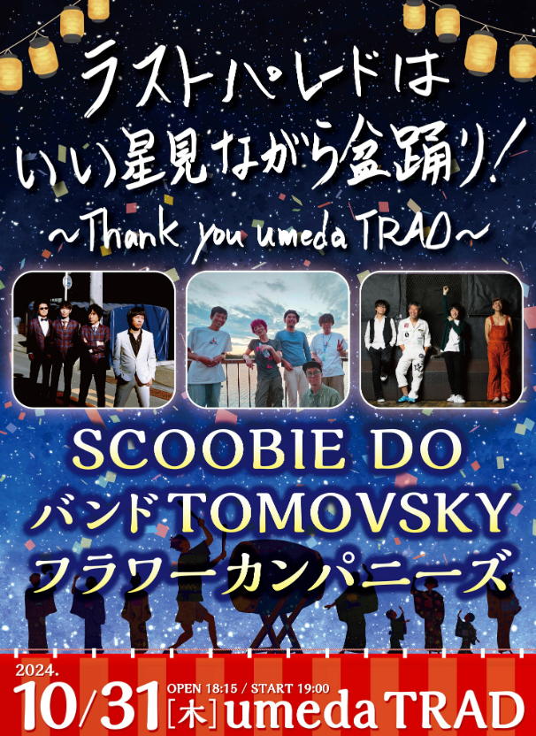 10月31日(木)大阪・umeda TRADで開催される『ラストパレードはいい星見ながら盆踊り!~Thank you umeda TRAD~』に、SCOOBIE DO、バンドTOMOVSKY、フラワーカンパニーズの3組が出演することがわかった。