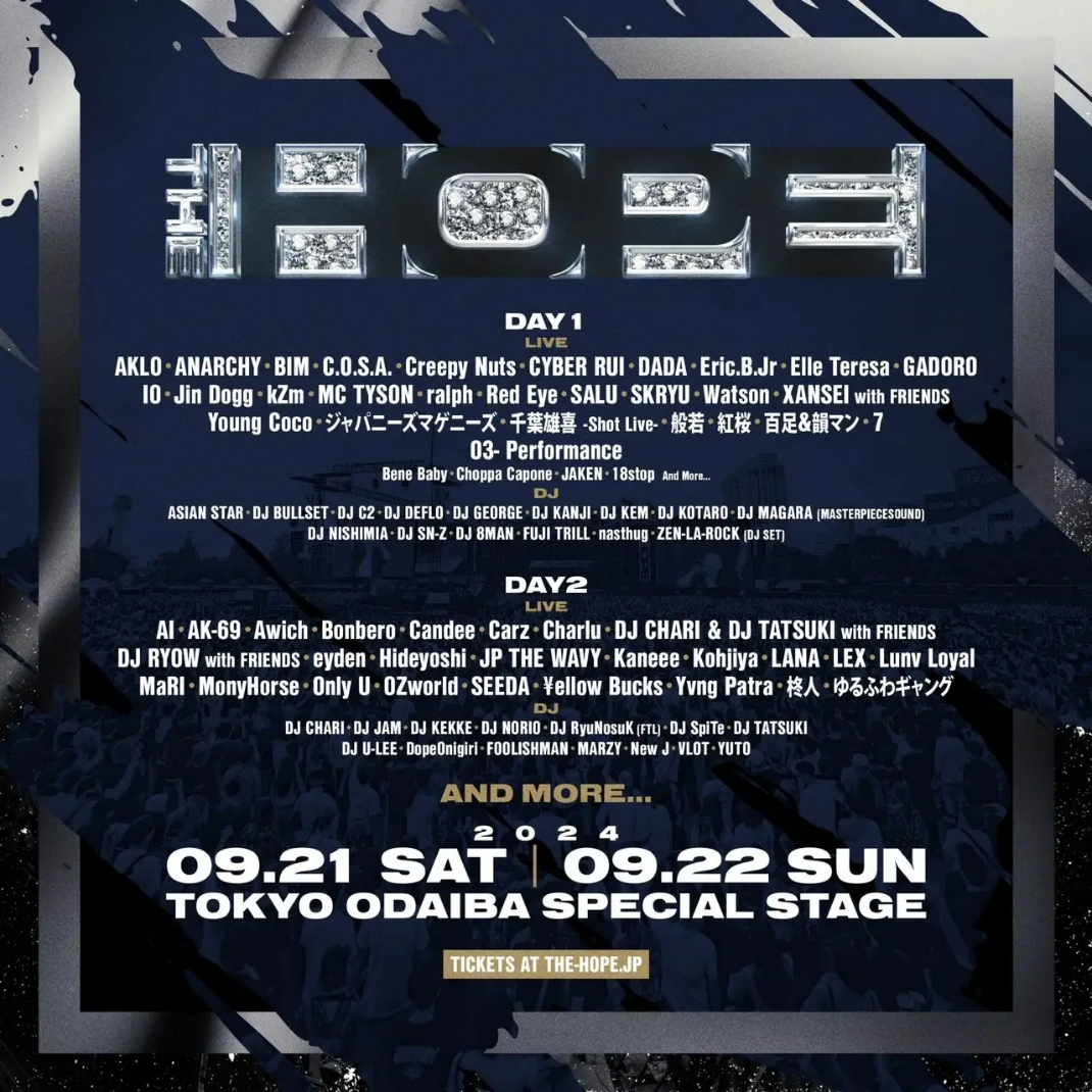 『THE HOPE』は、HIP HOPシーンの最前線で活躍するアーティストが世代を超えて集結する、日本最大級のHIP HOPフェス。3年目となる今年は、初となる2Daysで開催される。これまでに、総勢56組のアーティストと29組のDJが出演することがわかっていた。