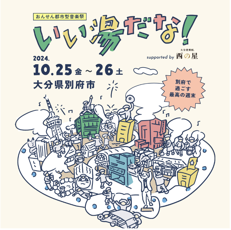 10月25日(金)、26日(土)の2日間、大分県別府市別府駅周辺(別府北浜)にて『おんせん都市型音楽祭「いい湯だな!」2024 Supported by 西の星』が開催される。