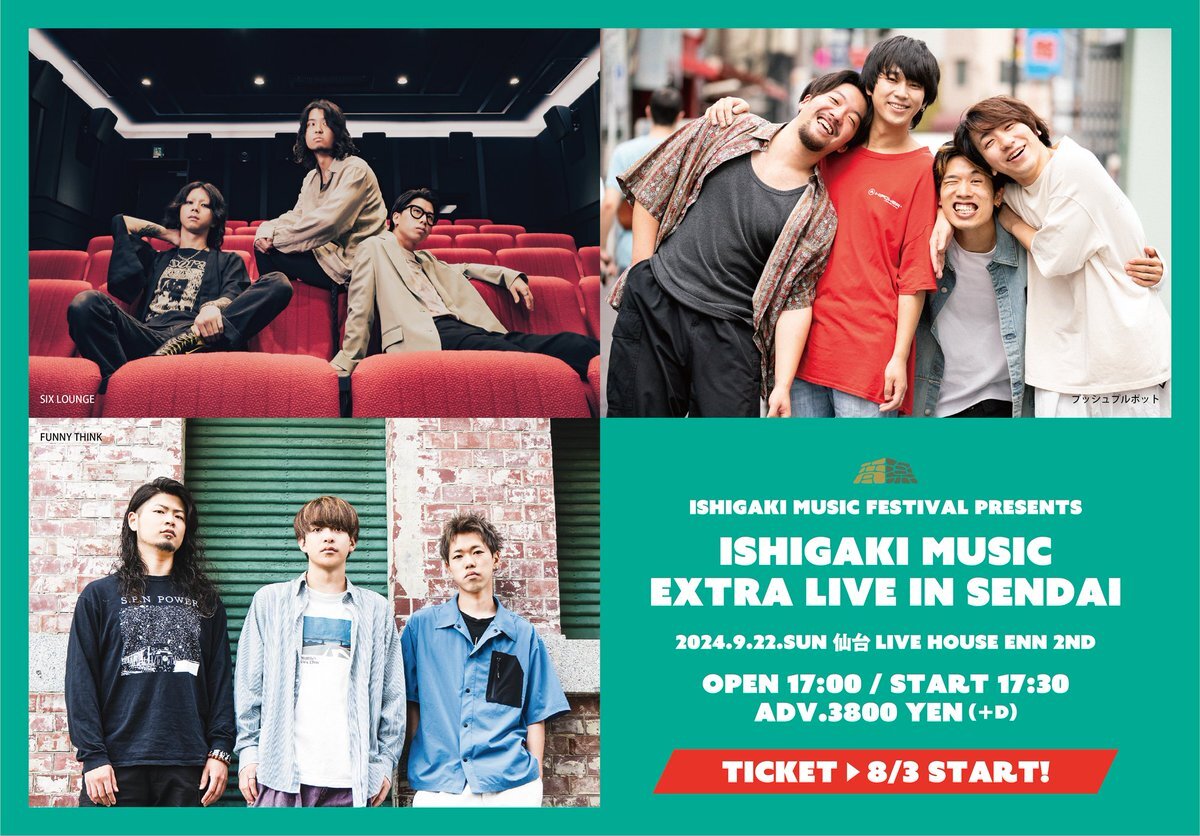 2024年9月22日(日)に、宮城県・仙台 LIVE HOUSE enn 2ndにて、ISHIGAKI MUSIC FESTIVAL PRESENTS『ISHIGAKI MUSIC EXTRA LIVE in SENDAI』の開催が決定。SIX LOUNGE、プッシュプルポット、FUNNY THINKの出演が決定した。