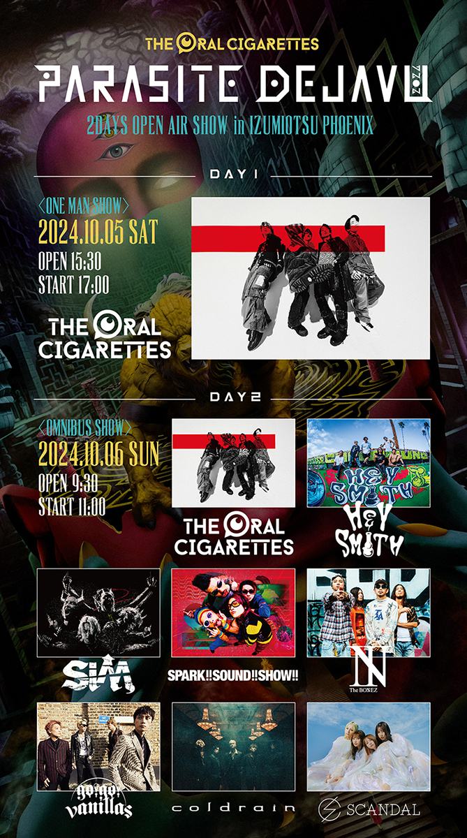THE ORAL CIGARETTESが10月5日・6日に大阪・泉大津フェニックスにて『PARASITE DEJAVU 2024 〜2DAYS OPEN AIR SHOW in IZUMIOTSU PHOENIX〜』を開催する。DAY2はオムニバス形式のイベントとして開催され、最終出演者としてSCANDALが発表となった。