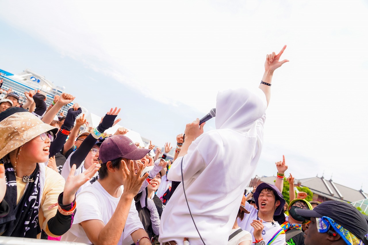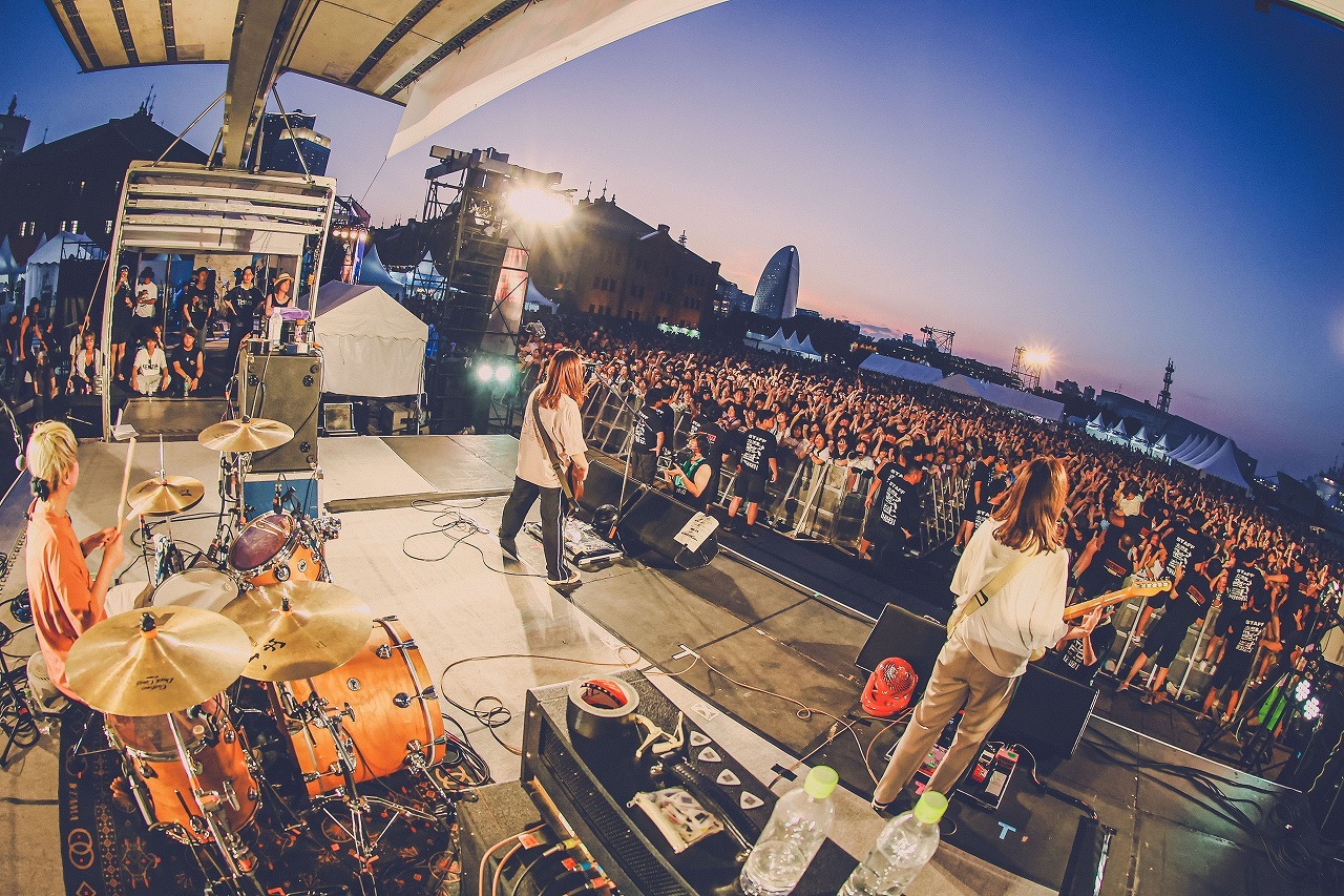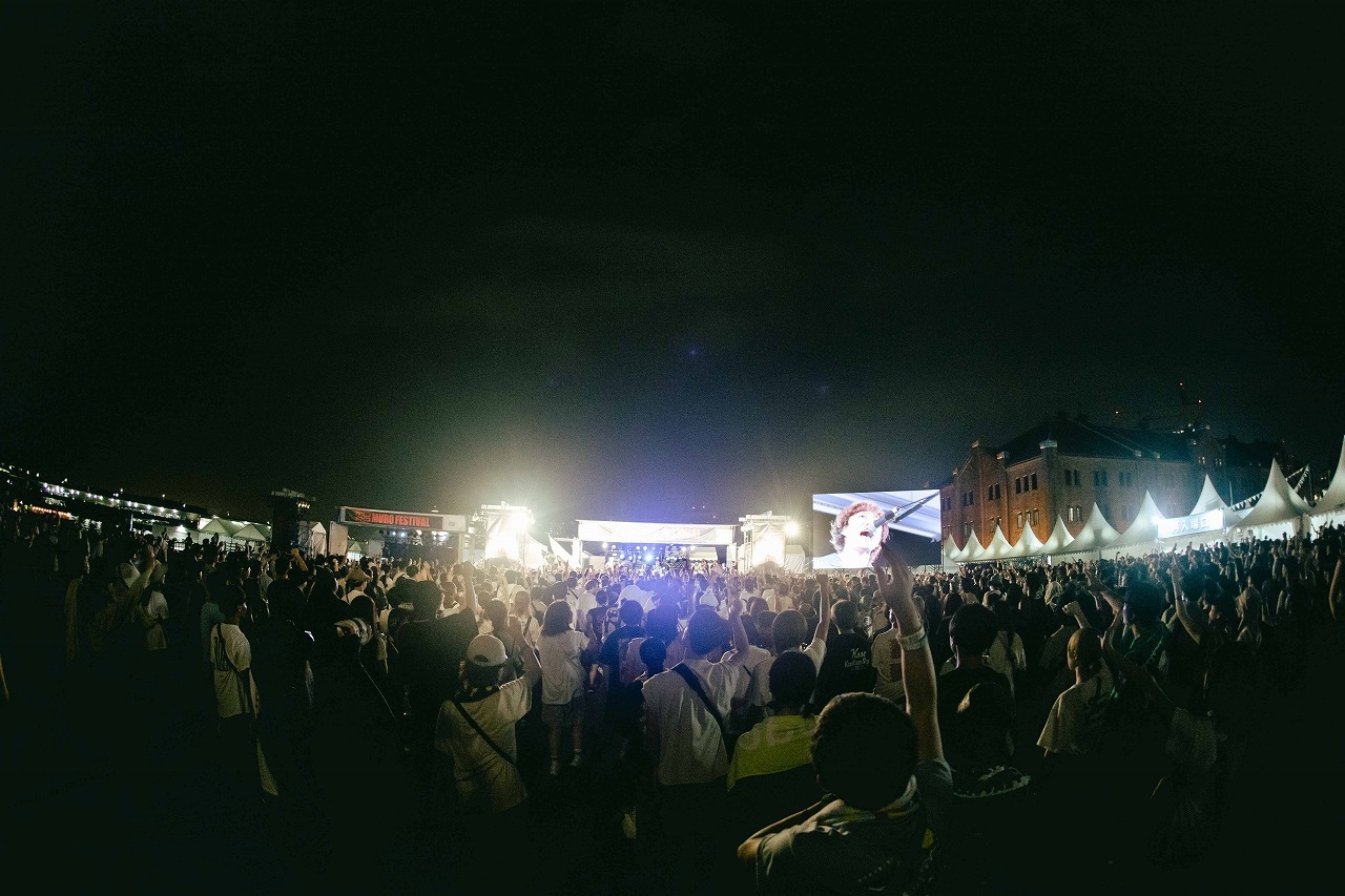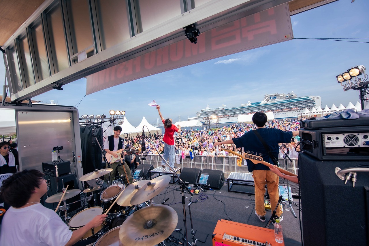リストバンド交換を済ませ、メインエントランスをくぐると、目の前に大きなライブスペースが現れた。向かって右手に「ムロ海ステージ」、左手に「ムロ芝生ステージ」、その周りには美しい海が広がっていて、クルーズ船やベイブリッジ、ランドマークタワー、観覧車まで見えるというロケーションが素敵。もうひとつの「ムロ赤レンガステージ」へのアクセスも良く、徒歩5分あれば移動可能な近さとなっている。また、転換のタイムロスを避けるよう、3ヵ所それぞれに「LEFT STAGE」と「RIGHT STAGE」が隣接されており、計6ステージでアーティストのパフォーマンスがテンポよく楽しめる仕様も嬉しい。