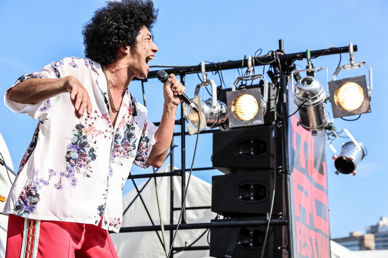 猛暑日も何のそのといった感じで、赤レンガステージをゴキゲンなダンスフロアに変えたBRADIO。来年で結成15周年のキャリアを誇る実力派、しかもニューアルバム『PARTY BOOSTER』のリリースツアーを2日前に終えたばかりで、笑っちゃうくらいバチバチに仕上がっている。ボーカル・真行寺貴秋の「ライブハウスがやってるフェスってことで、パッション全開で行こうと思ってます!」という言葉どおり、熱気に満ちた歌唱×心地よくリズミカルなファンクネス×すぐに真似できる振り付けで、初見のオーディエンスをもあっさりと巻き込む。「Flyers」の豪快なイントロとともに、大歓声が青空に抜けていったシーンが忘れられない。太陽の下、みんなが楽しく踊り、最高の光景がどんどん更新されていった。いつの間にか、辺りはFPP(FUNKY PARTY PEOPLE/BRADIOファンの総称)だらけ。柄シャツを纏ったこのバンド、夏が似合いすぎる。音楽って素晴らしい。