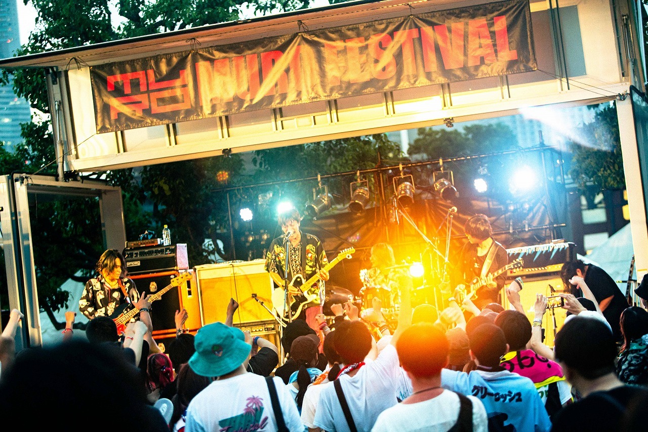 昨年メジャーデビューとはいえ、こちらも結成15年のw.o.d.。聴き手のハートを刺激する鋭利な声、ゴリッと歪ませたヘヴィでぶっといビートを軸に、渇望や葛藤を昇華させた破壊力満点のネオグランジサウンドを、海ステージでアグレッシブに轟かせる。夏の刹那をエモーショナルに歌った「1994」、終わらない快楽を呼ぶサイケデリックな最新曲「エンドレス・リピート」など、このシチュエーションにマッチした曲を純粋に選んでいる感じも、声高なアジテートではなく、脂が乗った3ピースのグルーヴでナチュラルにこちらを踊り狂わせてくれるのもいい。「『ムロフェス』はいちばんライブハウスっぽい野外フェスじゃないかな。ライブハウスってめちゃくちゃ自由で、優しい場所でもあると思ってるので、死にそうな人がいたら助けてあげてください」というボーカルのサイトウタクヤによるクールなMCを含め、ロックスター然とした佇まいの彼ら。夕暮れ時の演奏が画になっていた。