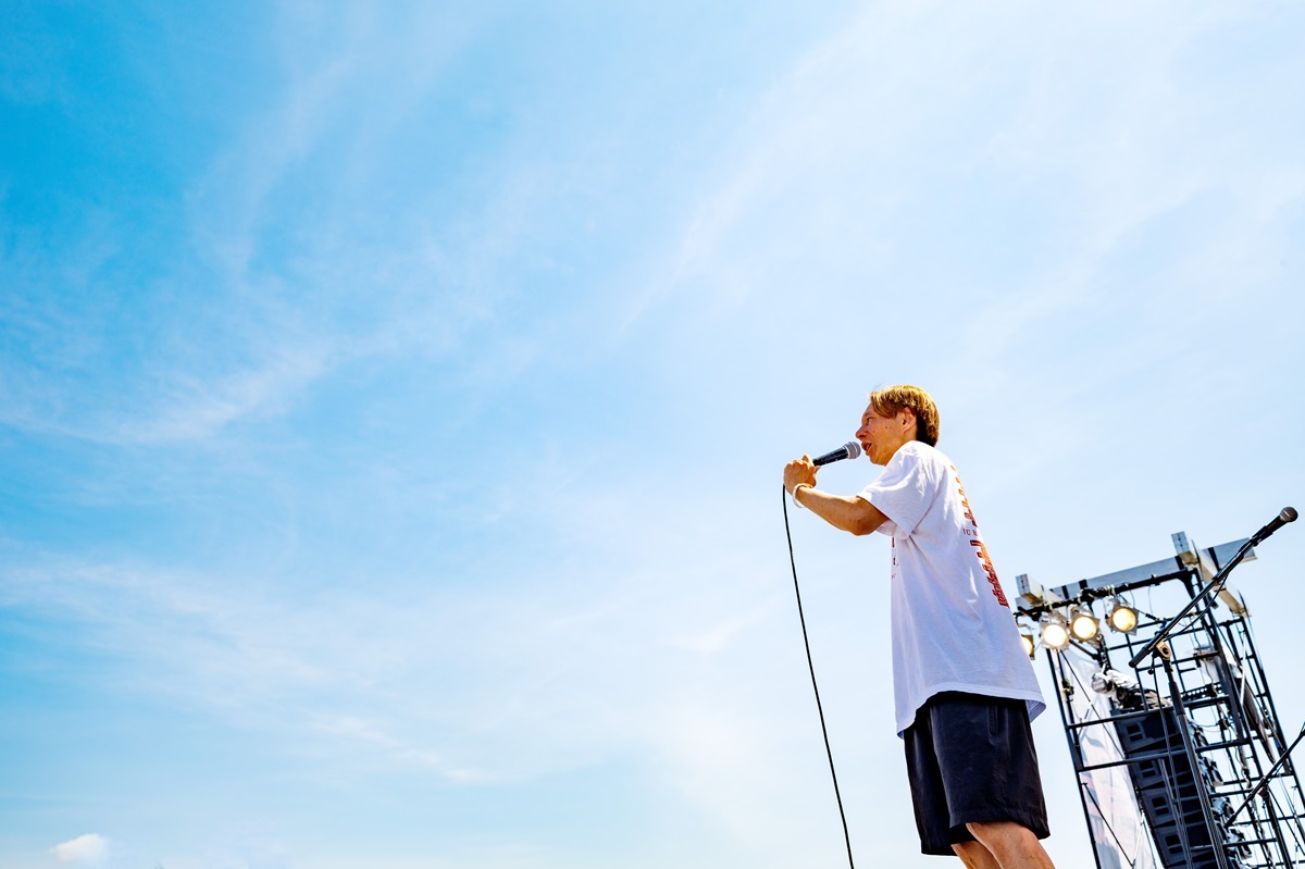 主催者の室による挨拶で、10時に無事開演。時速36km、鉄風東京と、バンド名だけで目の覚める音が聴こえてきそうなアクトが朝から並び、『ムロエッグ』枠のMOCKENを含め、パワフルでありつつ繊細さも感じさせる等身大のロックが、青空の下でエモーショナルに鳴らされていく。“トップバッターだろうがすべてを掻っ攫ってやる!”という気迫がビシビシ伝わるパフォーマンスに対し、オーディエンスも惜しみないリアクションを返す。みんな『ムロフェス』の現場にいられることがすごく嬉しそう。
